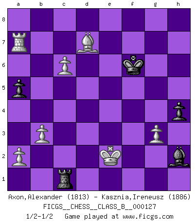 Last move : 1/2-1/2 2011 January 1 17:50:27 [Event "FICGS__CHESS__CLASS_B__000127"] [Site "FICGS"] [Date "2010.10.16"] [Round "1"] [White "Axon,Alexander"] [Black "Kasznia,Ireneusz"] [Result "1/2-1/2"] [WhiteElo "1813"] [BlackElo "1886"] 1.e4 e6 2.d4 d5 3.Nc3 dxe4 4.Nxe4 Nd7 5.Nf3 Ngf6 6.Nxf6+ Nxf6 7.Bd3 c5 8.Be3 Qb6 9.O-O Bd7 10.Qd2 Bc6 11.Qc3 Bxf3 12.dxc5 Qc6 13.gxf3 Be7 14.Rfe1 Qxf3 15.Bb5+ Kf8 16.Bf1 Nd5 17.Qb3 Nxe3 18.Rxe3 Qc6 19.Rd1 Rb8 20.Bg2 Qxc5 21.Rc3 Qe5 22.Rd7 h5 23.Qxb7 Kg8 24.Rc8+ Rxc8 25.Qxc8+ Kh7 26.Qc7 Qe1+ 27.Bf1 Bf6 28.b3 a5 29.Qc4 Kg8 30.Kg2 g5 31.Be2 g4 32.Ra7 Qc3 33.Qxc3 Bxc3 34.Rc7 Bd2 35.c4 Kg7 36.c5 Rd8 37.c6 Bf4 38.Ra7 Rd2 39.Kf1 Rd5 40.Bc4 Rc5 41.Bxe6 Bxh2 42.Bxf7 Kf6 43.Be8 h4 44.Bd7 Rc1+ 45.Ke2 g3 46.fxg3 1/2-1/2 French : Rubinstein variation Kingside Castling by player White (move 9) This chess game ended in a draw. Follow this game move after move (download)Winning isn't everything... but losing is nothing. (Mednis) Die Neutralität betrachte ich als eine schwere Krankheit. (Viktor Kortschnoi) La única cosa que los jugadores de Ajedrez tienen en común, es el Ajedrez. (Lodewijk Prins) Il n'y a plus de joueurs du niveau de Jacob Murray dont la seule quête est le beau jeu, le plaisir de voir les pièces construire quelque chose. Sur 10 idées à la minute, 9 seront sans intérêt, la dernière s'avèrera géniale. (Christian Bauer) Hold em is to stud what chess is to checkers. (Johnny Moss)