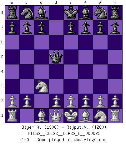 Last move : 1-0 2007 January 5 16:10:8 [Event "FICGS__CHESS__CLASS_E__000022"] [Site "FICGS"] [Date "2006.11.25"] [Round "1"] [White "Bayer,Alexander"] [Black "Rajput,Vishalsingh"] [Result "1-0"] [WhiteElo "1300"] [BlackElo "1200"] 1.c4 d5 2.cxd5 Qxd5 3.Nc3 1-0 This chess game has been lost on time (started : 2006.11.25 23:4:51) English Opening Player White won this chess game. Follow this game move after move (download)A good player is always lucky. (Jose Raul Capablanca) Über Karpov: Er war und ist ein Vertreter der russischen Reaktionäre. Das steckt tief in seiner Seele, wehalb ich nicht nett mit ihm umgehen kann. (Viktor Kortschnoi) Todo lo que importa ante el tablero de Ajedrez son buenas jugadas. (Bobby Fischer) Les échecs sont un jeu par leur forme, un art par leur essence et une science par sa difficulté d'acquisition. Ils peuvent vous procurer autant de plaisir qu'un bon livre ou une belle musique, mais vous n'aurez une réelle joie que si vous arrivez à bien jouer. (Tigran Petrosian) The only thing that matters is the evidence. (Horatio Caine, C.S.I. Miami)