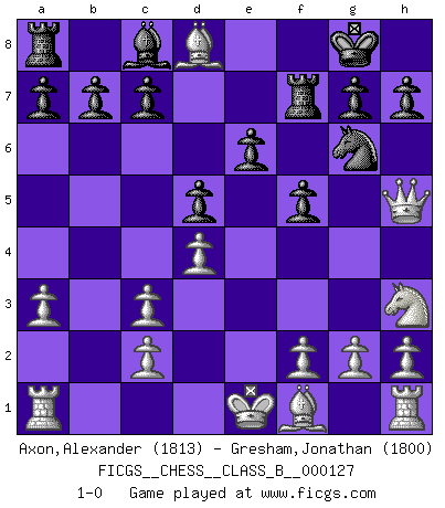 Last move : 1-0 2010 October 28 14:1:54 [Event "FICGS__CHESS__CLASS_B__000127"] [Site "FICGS"] [Date "2010.10.16"] [Round "1"] [White "Axon,Alexander"] [Black "Gresham,Jonathan"] [Result "1-0"] [WhiteElo "1813"] [BlackElo "1800"] 1.e4 e6 2.d4 d5 3.Nc3 Bb4 4.e5 f5 5.a3 Bxc3+ 6.bxc3 Nd7 7.Nh3 Ne7 8.Qh5+ Ng6 9.Bg5 Nf6 10.exf6 O-O 11.f7+ Rxf7 12.Bxd8 1-0 French : Winawer, Advance variation Kingside Castling by player Black (move 10) Player White won this chess game. Follow this game move after move (download)Many Chess players were surprised when after the game, Fischer quietly explained: 'I had already analyzed this possibility' in a position which I thought was not possible to foresee from the opening. (Mikhail Tal) Ein Isolani verdüstert die Stimmung auf dem ganzen Schachbrett. (Savielly Grigorievitsch Tartakower) Cuando veas una buena jugada, trata de encontrar otra mejor. (Emanuel Lasker) Le jeu d'échecs est comme rejeté hors du temps. (Antoine de Saint-Exupéry) Dave, my mind is going. I can feel it. (HAL 9000 in 2001, a space odyssey)