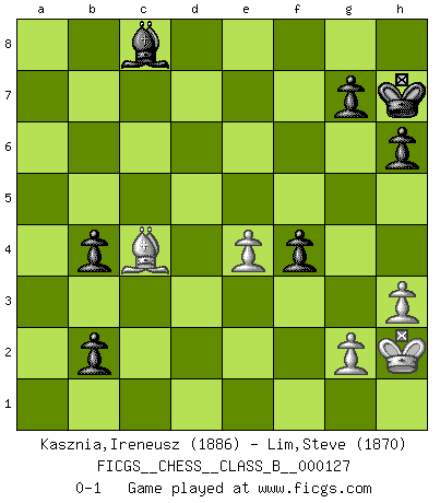 Last move : 0-1 2010 November 18 19:35:9 [Event "FICGS__CHESS__CLASS_B__000127"] [Site "FICGS"] [Date "2010.10.16"] [Round "1"] [White "Kasznia,Ireneusz"] [Black "Lim,Steve"] [Result "0-1"] [WhiteElo "1886"] [BlackElo "1870"] 1.d4 d5 2.c4 e6 3.Nc3 c6 4.e3 Nf6 5.Nf3 Nbd7 6.Bd3 dxc4 7.Bxc4 b5 8.Bd3 Bb7 9.e4 b4 10.Na4 c5 11.e5 Nd5 12.Nxc5 Nxc5 13.dxc5 Bxc5 14.O-O h6 15.Bb5+ Ke7 16.Nd2 Qb6 17.Bd3 Rhd8 18.Nb3 Kf8 19.Qe2 Ne7 20.Rd1 Qc6 21.Qg4 Bb6 22.Bf4 Rac8 23.Rac1 Qd5 24.Rxc8 Rxc8 25.Be2 Qc6 26.Bf3 Qc7 27.Rc1 Qb8 28.Rxc8+ Bxc8 29.Bg3 a5 30.Nd2 Ba6 31.Be2 Qd8 32.Nf1 Bb7 33.Ne3 Bxe3 34.fxe3 Nf5 35.Bf2 Qd2 36.Qc4 Kg8 37.Qd3 Qxb2 38.e4 Ne7 39.Bf1 Nc6 40.Qd7 Qxa2 41.Qe8+ Kh7 42.Qxf7 Bc8 43.Bc5 Qa1 44.Bf8 Qxe5 45.h3 b3 46.Bd3 Nb4 47.Bxb4 axb4 48.Bb1 Qc5+ 49.Kh2 Qc1 50.Bd3 Qd2 51.Qf1 e5 52.Bc4 b2 53.Qf8 Qf4+ 54.Qxf4 exf4 0-1 QGD : Semi-Slav Kingside Castling by player White (move 14) Player Black won this chess game. Follow this game move after move (download)Every Chess master was once a beginner. (Chernev) Frage: Was machen Sie mit den Preisen? Anwort: Ich habe Angst, dass meine Freundin davon neue Kleider kauft. (Loek van Wely) Aunque la mayoría de la gente disfruta observar las partidas de los grandes Maestros de ataque, algunos de los jugadores mas notables en la historia han sido los jugadores silenciosos posicionales. Lentamente ellos te aplastan despojandote de tu espacio, congestionando tus piezas y dejandote virtualmente sin nada que hacer. (Yasser Seirawan) Mais n'est-ce pas déjà le limiter injurieusement que d'appeler les échecs un jeu? N'est-ce pas aussi une science, un art, ou quelque chose qui, comme le cercueil de Mahomet entre ciel et terre, est suspendu entre l'un et l'autre, et qui réunit un nombre incroyable de contraires ? (Stefan Zweig) Political correctness is subjecting us to gross incompetence. (Johann Piek)