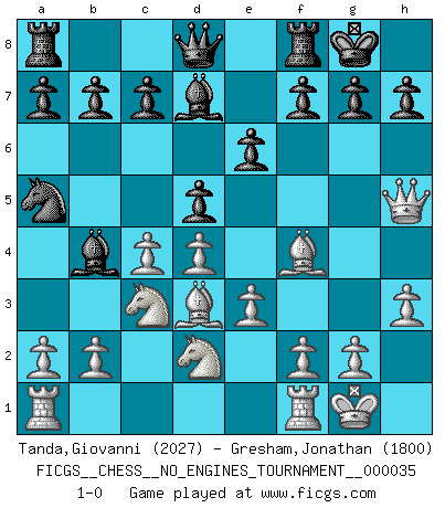 Last move : 1-0 2011 January 22 23:24:56 [Event "FICGS__CHESS__NO_ENGINES_TOURNAMENT__000035"] [Site "FICGS"] [Date "2010.10.16"] [Round "1"] [White "Tanda,Giovanni"] [Black "Gresham,Jonathan"] [Result "1-0"] [WhiteElo "2027"] [BlackElo "1800"] 1.d4 d5 2.Nf3 Nc6 3.Bf4 Nf6 4.e3 e6 5.c4 Be7 6.Nc3 O-O 7.h3 Bb4 8.Bd3 Na5 9.Nd2 Bd7 10.O-O Nh5 11.Qxh5 1-0 Queen's pawn game, Chigorin variation Kingside Castling by player Black (move 6) Kingside Castling by player White (move 10) Player White won this chess game. Follow this game move after move (download)Those who say they understand Chess, understand nothing. (Robert Hubner) Dass jemand wie Surab Asmaiparaschwili, der selbst Elopunkte gekauft hat , Vize-Präsident der Fide werden konnte, sagt schon einges über den Zustand dieser Organisation aus. (Joel Lautier) Cuando la partida de Ajedrez termina, el Peón y el Rey regresan a la misma caja. (Irish saying) Aucun coup ne doit être joué sans but. (Pedro Damiano) Some people are so afraid to die that they never begin to live. (Henry Van Dyke)