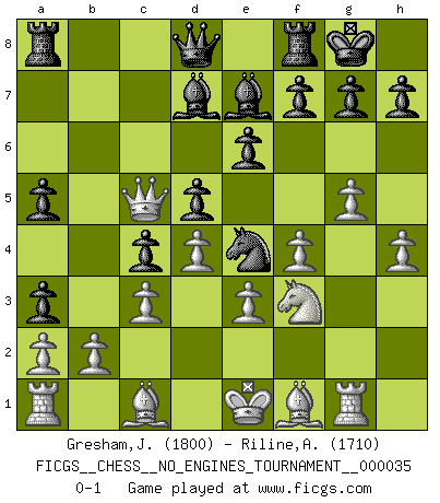 Last move : 0-1 2010 October 27 23:45:49 [Event "FICGS__CHESS__NO_ENGINES_TOURNAMENT__000035"] [Site "FICGS"] [Date "2010.10.16"] [Round "1"] [White "Gresham,Jonathan"] [Black "Riline,Alejandro"] [Result "0-1"] [WhiteElo "1800"] [BlackElo "1710"] 1.f4 d5 2.Nf3 Nf6 3.h3 c5 4.g4 Nc6 5.e3 Ne4 6.Rg1 e6 7.d3 Nd6 8.Na3 Be7 9.g5 O-O 10.h4 b5 11.d4 c4 12.c3 a5 13.Qc2 b4 14.Qa4 bxa3 15.Qxc6 Bd7 16.Qc5 Ne4 0-1 Bird's Opening Kingside Castling by player Black (move 9) Player Black won this chess game. Follow this game move after move (download)The chessboard is the world, the pieces are the phenomena of the Universe, the rules of the game are what we call the laws of Nature and the player on the other side is hidden from us. (Thomas Huxley) Es ist schade, dass viele Schachsportler vergessen, wie wichtig Auftreten und angemessene Kleidung sind. (Alexandra Kosteniuk) Al jugar al Ajedrez entonces, podemos aprender: Primero: Previsión... Segundo: Prudencia... Tercero: Cautela... Y al final, aprendemos del Ajedrez el hábito de no ser desanimados por apariencias malas presentes en el estado de nuestros asuntos, el hábito de la esperanza por una oportunidad favorable y la perseveración de los secretos de los recursos. (Benjamin Franklin) Le jeu d'échecs est comme rejeté hors du temps. (Antoine de Saint-Exupéry) For to win one hundred victories in one hundred battles is not the acme of skill. To subdue the enemy without fighting is the acme of skill. (Sun Tzu)