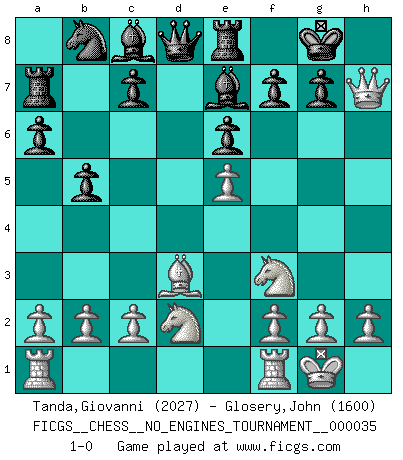 Last move : 1-0 2010 October 26 6:6:23 [Event "FICGS__CHESS__NO_ENGINES_TOURNAMENT__000035"] [Site "FICGS"] [Date "2010.10.16"] [Round "1"] [White "Tanda,Giovanni"] [Black "Glosery,John"] [Result "1-0"] [WhiteElo "2027"] [BlackElo "1600"] 1.d4 Nf6 2.Nf3 e6 3.Bg5 Be7 4.Nbd2 a6 5.Bxf6 Bxf6 6.e4 b5 7.Bd3 d6 8.O-O O-O 9.Qe2 Re8 10.e5 dxe5 11.dxe5 Be7 12.Qe4 Ra7 13.Qxh7+ 1-0 Queen's pawn : Torre attack Kingside Castling by player White (move 8) Kingside Castling by player Black (move 8) Player White won this chess game. Follow this game move after move (download)Checkers is for tramps. (Paul Morphy) Capablanka war das größte Genie der Schachgeschichte! Aber denken sie nicht er habe nichts vom Schach verstanden. Er wusste nur soviel wie er wissen musste um seine Ziele zu erreichen. (Mikhail Moiseyevich Botvinik) Del Ajedrez se ha dicho que la vida no es lo suficientemente larga para él, pero eso es culpa de la vida, no del Ajedrez. (William Ewart Napier) Psychologiquement, tu dois avoir confiance en toi même, mais cette confiance doit être basée sur des faits. (Robert Fischer) There is no instance of a country having benefited from prolonged warfare. (Sun Tzu)