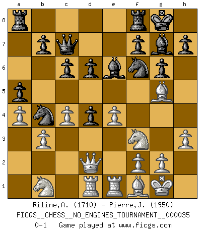 Last move : 0-1 2011 February 26 23:10:34 [Event "FICGS__CHESS__NO_ENGINES_TOURNAMENT__000035"] [Site "FICGS"] [Date "2010.10.16"] [Round "1"] [White "Riline,Alejandro"] [Black "Pierre,Jonathan"] [Result "0-1"] [WhiteElo "1710"] [BlackElo "1950"] 1.e4 d6 2.d4 Nf6 3.Nc3 g6 4.h3 c6 5.Nf3 Bg7 6.a4 O-O 7.Be2 a5 8.O-O Na6 9.Bg5 Nb4 10.Re1 Qc7 11.Bf1 e5 12.Qd2 Be6 13.Rad1 Rad8 14.b3 Rc8 15.Nb1 Ra8 16.c4 exd4 0-1 Pirc defense Kingside Castling by player Black (move 6) Kingside Castling by player White (move 8) Player Black won this chess game. Follow this game move after move (download)The most important feature of the Chess position is the activity of the pieces. This is absolutely fundamental in all phases of the game: Opening, Middlegame and especially Endgame. The primary constraint on a piece's activity is the Pawn structure. (Michael Stean) Kleine Schachspieler machen Mist, und große Schachspieler machen Mist, aber große machen weniger Mist. (Fritz Sämisch) El Ajedrez es 99 por ciento táctica. (Teichmann) Il vaut toujours mieux jouer un plan faux de façon logique que de n'avoir pas de plan du tout. (Victor Kortchnoï) Those parts of the system that you can hit with a hammer (not advised) are called hardware; those program instructions that you can only curse at are called software. (Anonymous)