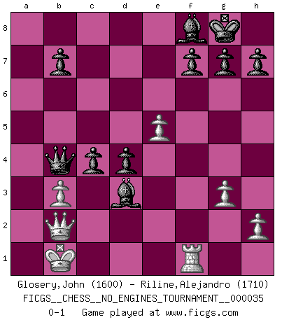 Last move : 0-1 2010 October 18 1:42:45 [Event "FICGS__CHESS__NO_ENGINES_TOURNAMENT__000035"] [Site "FICGS"] [Date "2010.10.16"] [Round "1"] [White "Glosery,John"] [Black "Riline,Alejandro"] [Result "0-1"] [WhiteElo "1600"] [BlackElo "1710"] 1.e4 c5 2.Nc3 Nc6 3.f4 e6 4.Nf3 d5 5.exd5 exd5 6.Qe2+ Be7 7.b3 Nf6 8.Bb2 O-O 9.O-O-O Bf5 10.d3 Re8 11.Qf2 Bd6 12.g3 d4 13.Nb5 Ng4 14.Qg1 Bf8 15.Na3 a5 16.Nb5 a4 17.Kb1 axb3 18.cxb3 Ne3 19.Rc1 Nb4 20.Ne5 Rxa2 21.Na3 Rxe5 22.fxe5 Qa5 23.Rc4 Rxa3 24.Bxa3 Qxa3 25.Rxb4 Qxb4 26.Qf2 c4 27.Qb2 Nxf1 28.Rxf1 Bxd3+ 0-1 Sicilian : Grand Prix attack Kingside Castling by player Black (move 8) Queenside Castling by player White (move 9) Player Black won this chess game. Follow this game move after move (download)I believe that Chess possesses a magic that is also a help in advanced age. A rheumatic knee is forgotten during a game of Chess and other events can seem quite unimportant in comparison with a catastrophe on the chessboard. (Vlastimil Hort) Früher wurde jeder komplizierte Zug, jedes interessante Opfer mit großem Beifall und Enthusiasmus aufgenommen. Heute schaltet man einfach seinen Fritz an, und man kann sehen, was los ist, ob der Zug geht oder nicht. (Vladimir Kramnik) Debió haber existido una vez en que los hombres eran semidióses, de otra manera no hubiesen podido inventar el Ajedrez. (Gustav Schenk) 'L'échange des dames est un coup dur pour les deux adversaires...' Un journaliste lors d'une partie du match Spassky-Fischer Watch your thoughts; they become words. Watch your words; they become actions. Watch your actions; they become habits. Watch your habits; they become character. Watch your character; it becomes your destiny. (Frank Outlaw)