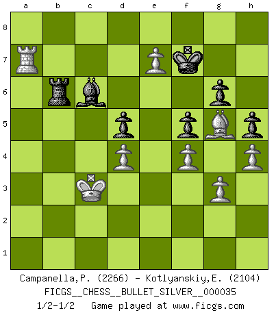 Last move : 1/2-1/2 2010 October 17 1:56:36 [Event "FICGS__CHESS__BULLET_SILVER__000035"] [Site "FICGS"] [Date "2010.10.17"] [Round "1"] [White "Campanella,Paul"] [Black "Kotlyanskiy,Edward"] [Result "1/2-1/2"] [WhiteElo "2266"] [BlackElo "2104"] 1.e4 e6 2.d4 d5 3.Nc3 Bb4 4.e5 Ne7 5.a3 Bxc3+ 6.bxc3 c5 7.Qg4 O-O 8.Bd3 c4 9.Bh6 Ng6 10.Bxg6 fxg6 11.Be3 Bd7 12.h4 Qa5 13.Ne2 Rf5 14.Kd2 Be8 15.Ng3 h5 16.Qh3 Rf7 17.Qxe6 Nd7 18.Qd6 Nf8 19.Ne2 Rd8 20.Qb4 Qc7 21.Nf4 b5 22.f3 a5 23.Qb2 Qc8 24.Ke2 Qf5 25.Nh3 Bc6 26.Rhe1 Ne6 27.Ng5 Nxg5 28.Bxg5 Rdf8 29.Rf1 Bd7 30.a4 b4 31.cxb4 axb4 32.Rfc1 Rb8 33.a5 c3 34.Qb1 Bb5+ 35.Kf2 Ba6 36.Re1 Qe6 37.Re3 Rfb7 38.Kg1 Bc4 39.Kh2 Kh8 40.Qe1 Re8 41.Qc1 Kg8 42.f4 Rb5 43.a6 Ra8 44.a7 Kh7 45.Qb1 Kg8 46.Ra4 b3 47.cxb3 Rxb3 48.Qc2 Rb7 49.Rxc3 Rbxa7 50.Rxa7 Rxa7 51.Qb1 Kh7 52.Rf3 Qf5 53.Qxf5 gxf5 54.e6 Ra8 55.Re3 Kg8 56.Re5 g6 57.Re1 Bb5 58.Rb1 Be8 59.Rb6 Rc8 60.e7 Rc6 61.Rb8 Kf7 62.Rd8 Rc7 63.Kg3 Rb7 64.Kf2 Rb2+ 65.Ke3 Rb5 66.Kd2 Ra5 67.Kc3 Rb5 68.Rd6 Kg7 69.Rf6 Bf7 70.g3 Kg8 71.Ra6 Be8 72.Ra8 Kf7 73.Rc8 Rb6 74.Rd8 Rb5 75.Ra8 Rb6 76.Ra5 Bc6 77.Ra7 1/2-1/2 French : Winawer, Advance variation Kingside Castling by player Black (move 7) This chess game ended in a draw. Follow this game move after move (download)The sign of a great Master is his ability to win a won game quickly and painlessly. (Irving Chernev) Der 70jährige Viktor Kortschnoi: Die Rentenanstalt wollte mich zwingen in Rente zu gehen. Meine Frau erhält jetzt eine Pension- und ich zahle weiter in die Rentenkasse ein! (Viktor Kortschnoi) Me dio la sensación de como si yo estuviera jugando en contra del mismo Ajedrez. - al estar jugando en contra de Robert Fischer (Walter Shipman) En blitz, le Cavalier l'emporte sur le Fou. (Vlastimil Hort) My poor ole parrot... Is not in the circulation of displays ....poo hoo hoo :) (Wayne Lowrance's enigma)
