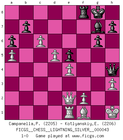 Last move : 1-0 2010 October 17 4:14:10 [Event "FICGS__CHESS__LIGHTNING_SILVER__000043"] [Site "FICGS"] [Date "2010.10.17"] [Round "1"] [White "Campanella,Paul"] [Black "Kotlyanskiy,Edward"] [Result "1-0"] [WhiteElo "2205"] [BlackElo "2206"] 1.e4 g6 2.d4 d6 3.Nc3 Bg7 4.Nf3 c6 5.Be2 Nf6 6.O-O Bg4 7.h3 Bxf3 8.Bxf3 O-O 9.Be3 Nbd7 10.Re1 Qc7 11.a4 e5 12.d5 cxd5 13.exd5 a6 14.a5 Rac8 15.Ra4 Ne8 16.Be2 f5 17.Rc4 Qd8 18.Rxc8 Qxc8 19.Na4 Nef6 20.c4 f4 21.Bd2 f3 22.gxf3 Nh5 23.Bf1 Qc7 24.b4 Nf4 25.Nc3 Qd8 26.Ne4 Nf6 27.c5 Nxe4 28.fxe4 Qh4 29.Bxf4 Qxf4 30.Qe2 Qg5+ 31.Kh1 dxc5 32.bxc5 Qh4 33.c6 1-0 Thibault de Vassal Always a pleasure to watch your games guys ;) Robatsch (Modern) defense Kingside Castling by player White (move 6) Kingside Castling by player Black (move 8) Player White won this chess game. Follow this game move after move (download)My style is somewhere between that of Tal and Petrosian. (Reshevsky) Ich hatte Zahnschmerzen im ersten Spiel. In der zweiten Partie tat mir der Kopf weh. In der dritten war es eine Rheuma-Attacke und während der vierten fühlte ich mich nicht gut. Und in der fünften? Nun, man muss doch nicht jedes Spiel gewinnen, oder? (Savielly Grigorievitsch Tartakower) El Ajedrez es un expediente tonto que hace creer a la gente inactiva que hacen una cosa muy astuta cuando solamente estan perdiendo su tiempo. (George Bernard Shaw) Shah mat. Le roi est mort. Cri de fierté d'un joueur venant de terrasser son adversaire, courtoisement, sans effusion de sang. I find television to be very educating. Every time somebody turns on the set, I go in the other room and read a book. (Groucho Marx)