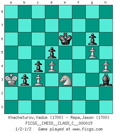 Last move : 1/2-1/2 2007 May 1 2:42:35 [Event "FICGS__CHESS__CLASS_C__000019"] [Site "FICGS"] [Date "2006.11.27"] [Round "1"] [White "Khachaturov,Vadim"] [Black "Repa,Jason"] [Result "1/2-1/2"] [WhiteElo "1700"] [BlackElo "1700"] 1.d4 e6 2.e4 d5 3.Nc3 Nf6 4.Bg5 Bb4 5.e5 h6 6.Bd2 Bxc3 7.bxc3 Ne4 8.Qg4 g6 9.Bd3 Nxd2 10.Kxd2 c5 11.Nf3 Bd7 12.Rab1 c4 13.Be2 b6 14.Qf4 Qe7 15.h4 Bc6 16.Nh2 Nd7 17.Ng4 h5 18.Ne3 f6 19.exf6 Nxf6 20.Bf3 Kd7 21.Qe5 Raf8 22.Rbe1 Qd6 23.Qg3 Qxg3 24.fxg3 Kd6 25.g4 Bd7 26.g5 Ne8 27.Ref1 Ng7 28.g4 hxg4 29.Bxg4 Rxf1 30.Nxf1 Rf8 31.Ne3 Rf2+ 32.Ke1 Rf7 33.Rf1 Be8 34.Rf2 Rxf2 35.Kxf2 Bf7 36.Ke2 e5 37.Kd2 Ne6 38.Bxe6 Bxe6 39.Ke2 b5 40.a3 a5 41.Kd2 Bh3 42.Kd1 Ke6 43.Kc1 b4 44.axb4 axb4 45.Kd2 exd4 46.cxd4 Bf5 47.Kc1 Be4 48.Kb2 Kd7 49.c3 b3 50.Ka3 Ke6 51.Kb2 Kd6 52.Ka3 Bf3 53.Kb2 Ke6 54.Ka3 Bh5 55.Kb2 Be2 56.Ka3 Bd3 57.Kb2 Bf5 58.Ka3 Bh3 59.Kb2 Kd6 60.Ka3 Ke6 1/2-1/2 Queen's pawn This chess game ended in a draw. Follow this game move after move (download)Becoming successful at Chess allows you to discover your own personality. That's what I want for the kids I teach. (Saudin Robovic) Es hat in meinem Leben Zeiten gegeben, in denen das Schachspiel, wenn nicht zum Lebenszweck, so doch zu einem regelrechten Lebensersatz geworden ist. Man fühlt sich in solchen Zeiten nicht so, als besäße man eine göttliche Gabe, sondern eher so, als sei man von ihr besessen. (Garry Kasparov) Una victoria por una combinación errónea, aunque sea espectacular, me llena de horror artístico. (Wilhelm Steinitz) Si rien de grave n'est détecté lors de l'analyse d'une position, on joue alors le coup. Seconde règle de Blumenfeld. Even the best needles are not sharp at both ends. (Chinese proverb)