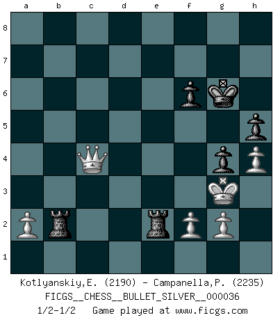 Last move : 1/2-1/2 2010 October 17 17:56:10 [Event "FICGS__CHESS__BULLET_SILVER__000036"] [Site "FICGS"] [Date "2010.10.17"] [Round "1"] [White "Kotlyanskiy,Edward"] [Black "Campanella,Paul"] [Result "1/2-1/2"] [WhiteElo "2190"] [BlackElo "2235"] 1.Nf3 d5 2.c4 c6 3.d4 Nf6 4.Nc3 e6 5.Bg5 h6 6.Bh4 dxc4 7.e4 g5 8.Bg3 b5 9.Be2 Bb7 10.h4 g4 11.Ne5 h5 12.O-O Nbd7 13.d5 cxd5 14.exd5 exd5 15.Nxb5 a6 16.Nxd7 axb5 17.Nxf8 d4 18.Be5 d3 19.Nd7 Kxd7 20.Bxd3 Ke6 21.Re1 Qxd3 22.Qc1 Qd5 23.Bc3 Ne4 24.Qf4 Rad8 25.Qc7 f6 26.Rxe4+ Qxe4 27.Re1 Qxe1+ 28.Bxe1 Rd1 29.Qb6+ Kf5 30.Qxb5+ Kg6 31.Qxb7 Rxe1+ 32.Kh2 Rhe8 33.Kg3 Rb1 34.Qc6 Re2 35.Qxc4 R1xb2 1/2-1/2 Reti Opening Kingside Castling by player White (move 12) This chess game ended in a draw. Follow this game move after move (download)I look one move ahead... the best ! (Siegbert Tarrasch) Ich rechne überhaupt nicht voraus. Ich gewinne auch so. (Robert James Fischer) El Ajedrez es un terrible juego. Si no controlas el centro, tu oponente tiene una posición mas holgada. Si tienes control del centro, ¡entonces realmente tu tienes algo de que preocuparte!. (Siegbert Tarrasch) Aucun coup ne doit être joué sans but. (Pedro Damiano) Sometimes it pays to stay in bed in Monday, rather than spending the rest of the week debugging Monday's code. (Dan Salomon)