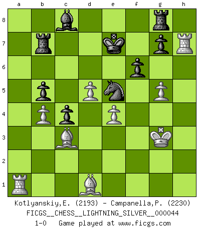 Last move : 1-0 2010 October 17 20:29:28 [Event "FICGS__CHESS__LIGHTNING_SILVER__000044"] [Site "FICGS"] [Date "2010.10.17"] [Round "1"] [White "Kotlyanskiy,Edward"] [Black "Campanella,Paul"] [Result "1-0"] [WhiteElo "2193"] [BlackElo "2230"] 1.d4 d5 2.Nf3 Nf6 3.c4 c6 4.Nc3 e6 5.e3 Nbd7 6.Qc2 Bd6 7.Bd3 O-O 8.O-O dxc4 9.Bxc4 a6 10.Rd1 b5 11.Bd3 Bb7 12.Ng5 Bxh2+ 13.Kxh2 Ng4+ 14.Kg1 Qxg5 15.f3 Ngf6 16.e4 Qh4 17.Be3 Rfc8 18.Qd2 h6 19.b4 e5 20.Ne2 Nh5 21.a4 Rd8 22.Bf2 Qe7 23.g4 Nhf6 24.Ng3 Nh7 25.Nf5 Qf6 26.Kg2 Ng5 27.Bh4 Rab8 28.f4 exf4 29.Qxf4 Re8 30.Rf1 Nf8 31.Nxh6+ Qxh6 32.Bxg5 Qg6 33.Qf5 c5 34.d5 c4 35.Bc2 f6 36.Bd2 Bc8 37.Qxg6 Nxg6 38.axb5 axb5 39.Kg3 Ne5 40.g5 Kf7 41.Bc3 Rb7 42.Bd1 Ke7 43.Rh1 Rg8 44.Rh7 1-0 Queen's pawn game Kingside Castling by player Black (move 7) Kingside Castling by player White (move 8) Player White won this chess game. Follow this game move after move (download)There must have been a time when men were demigods, or they could not have invented Chess. (Gustav Schenk) Jeder leidlich begabte Spieler, er braucht keineswegs hervorragend veranlagt zu sein, kann es zum Meister bringen. Aber das ist ja auch gar nicht nötig! Der richtige Standpunkt ist es, zu seinem Vergnügen zu spielen, und man glaube ja nicht, dass der Genuss proportional dem Können sei. (Siegbert Tarrasch) Coloca el contenido de las piezas del Ajedrez en un sombrero, agitalo vigorosamente, arrojalas en un tablero desde una altura de 30 centimetros y así obtendras el estilo de Steinitz. (H. E. Bird) Vous m'avez demandé de vous exposer quel est le fondement de la prière. Je ne fais que préparer les pièces du jeu sur la table... Nous sera-t-il permis d'en adopter les règles et si nous les appliquons scrupuleusement nous ne tarderons pas à faire mat le Roi divin ! Il ne pourra échapper à nos mains. (Sainte Thérèse d'Avila, Chemin de perfection) If passion drives you, let reason holds the reins. (Benjamin Franklin)