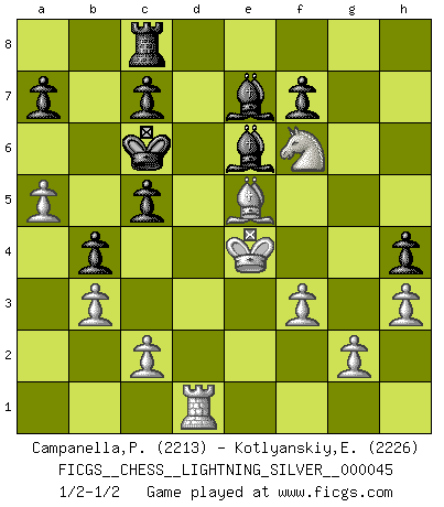 Last move : 1/2-1/2 2010 October 17 20:57:16 [Event "FICGS__CHESS__LIGHTNING_SILVER__000045"] [Site "FICGS"] [Date "2010.10.17"] [Round "1"] [White "Campanella,Paul"] [Black "Kotlyanskiy,Edward"] [Result "1/2-1/2"] [WhiteElo "2213"] [BlackElo "2226"] 1.e4 e5 2.Nf3 Nc6 3.Bb5 Nf6 4.O-O Nxe4 5.d4 Nd6 6.Bxc6 dxc6 7.dxe5 Nf5 8.Qxd8+ Kxd8 9.Nc3 Bd7 10.h3 Kc8 11.b3 h6 12.Bb2 Be7 13.Rfd1 Rd8 14.a4 Nh4 15.Nxh4 Bxh4 16.Ne4 b6 17.e6 Bxe6 18.Rxd8+ Bxd8 19.Bxg7 h5 20.a5 c5 21.f3 Kb7 22.Kf2 Kc6 23.Be5 h4 24.Nf6 b5 25.Rd1 Be7 26.Ke3 Rc8 27.Ke4 b4 1/2-1/2 Ruy Lopez : Berlin defense, Open variation Kingside Castling by player White (move 4) This chess game ended in a draw. Follow this game move after move (download)It was clear to me that the vulnerable point of the American Grandmaster (Bobby Fischer) was in double-edged, hanging, irrational positions, where he often failed to find a win even in a won position. (Efim Geller) Je mehr ich von der FIDE weiss, um so weniger verstehe ich. (Alexander Kalifman) El Peón aislado arroja penumbra sobre todo el tablero. (Aaron Nimzovich) Aux échecs, les retours au sommet sont rares : les dommages psychologiques consécutifs à une défaite sont trop sévères. (Daily Telegraph) Memory is a way of holding onto the things you love, the things you are, the things you never want to lose. (from the television show: The Wonder Years)