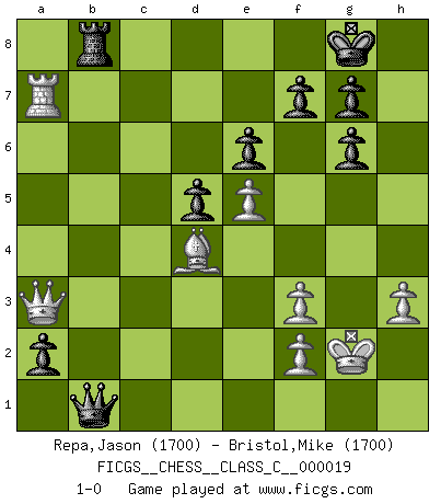 Last move : 1-0 2007 July 6 22:4:40 [Event "FICGS__CHESS__CLASS_C__000019"] [Site "FICGS"] [Date "2006.11.27"] [Round "1"] [White "Repa,Jason"] [Black "Bristol,Mike"] [Result "1-0"] [WhiteElo "1700"] [BlackElo "1700"] 1.e4 Nf6 2.e5 Ng8 3.Nf3 d5 4.d4 Bg4 5.Bd3 e6 6.O-O c5 7.c3 Nc6 8.Nbd2 cxd4 9.cxd4 Qb6 10.h3 Bh5 11.Nb3 a5 12.Be3 a4 13.Nc5 Bxc5 14.dxc5 Qb4 15.a3 Qxb2 16.Rb1 Qxa3 17.Rxb7 Nge7 18.Qc2 Bxf3 19.Bc1 Nd4 20.Qb1 Qxc5 21.Be3 O-O 22.Rc1 Qa5 23.Bxd4 Ng6 24.Bb6 Qd2 25.Be3 Qa5 26.Rc5 Qd8 27.Bxg6 hxg6 28.gxf3 a3 29.Qa2 Ra4 30.R5c7 Qh4 31.Kg2 Qh5 32.Qb3 R4a8 33.Qc3 a2 34.Ra7 Qf5 35.Qb2 Qb1 36.Bd4 Rfb8 37.Qa3 Rxa7 38.Rxa7 1-0 This chess game has been lost on time (started : 2006.11.27 5:12:45) Alekhine's defense : Brooklyn defense Kingside Castling by player White (move 6) Kingside Castling by player Black (move 21) Player White won this chess game. Follow this game move after move (download)Chess is 99 percent tactics. (Teichmann) Dieses schreckliche Gefühl, dass ich gegen eine Maschine spielte, die niemals Fehler macht, zerschmetterte meinen Widerstand. (Mark Taimanov) El ganar no lo es todo... pero el perder es nada. (Mednis) Le jeu d'échecs fait naître et fortifie en nous plusieurs qualités précieuses dans le cours de l'existence, telles que la prévoyance, la circonspection, la prudence, et la persévérance. (Benjamin Franklin - 1783, la morale des échecs) Philosophers use a language that is already deformed as though by shoes that are too tight. (Ludwig Wittgenstein)