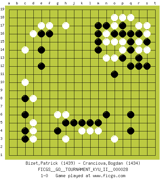 Last move : 1-0 2011 March 21 0:35:23 [Event "FICGS__GO__TOURNAMENT_KYU_II__000028 "] [Site "FICGS"] [Date "2010.10.19"] [Round "1"] [Black "Bizet,Patrick "] [White "Cranciova,Bogdan "] [Result "1-0"] [Rating 1 "1439"] [Rating 2 "1434"] 1.q4 d16 2.q16 d4 3.c6 d8 4.c4 d3 5.c3 d5 6.c8 k4 7.g4 g6 8.h5 h6 9.j5 o3 10.q6 o17 11.f16 h17 12.o16 q18 13.p17 p18 14.n17 o18 15.m16 r17 16.r16 s16 17.s15 s17 18.r12 f17 19.o11 c10 20.n6 h3 21.k5 l4 22.l5 m4 23.m5 n15 24.m15 n16 25.m17 o15 26.p16 r15 27.q15 r14 28.q14 s14 29.s12 n13 30.m14 q13 31.p13 p14 32.q12 p15 33.r13 o13 34.e16 e17 35.e14 c14 36.e12 1-0 This go game has been lost on time (started : 2010.10.19 14:19:53) Here are the names of the openings (joseki) played in the four corners : Corner d4 : d4 c6Hoshi (Hwajeom, Seongjeom, Xingwei`) 4-4 Point. The star or hoshi (4-4) point, emphasizing influence at the potential expense of territory.Ikken Kakari (Hankan Keolch'im, Yi Gua`jiao~, 1-Space Low Approach). Black 2 is the standard approach move to the 4-4. Corner q4 : q4 o3Hoshi (Hwajeom, Seongjeom, Xingwei`) 4-4 Point. The star or hoshi (4-4) point, emphasizing influence at the potential expense of territory.Ikken Kakari (Hankan Keolch'im, Yi Gua`jiao~, 1-Space Low Approach). White 2 is the standard approach move to the 4-4. Corner q16 : q16 o17Hoshi (Hwajeom, Seongjeom, Xingwei`) 4-4 Point. The star or hoshi (4-4) point, emphasizing influence at the potential expense of territory.Ikken Kakari (Hankan Keolch'im, Yi Gua`jiao~, 1-Space Low Approach). White 2 is the standard approach move to the 4-4. Corner d16 : d16 f16Hoshi (Hwajeom, Seongjeom, Xingwei`) 4-4 Point. The star or hoshi (4-4) point, emphasizing influence at the potential expense of territory.Ikken Takagakari (Hankan Nop'dakeolch'im, Yi Gaojia, 1-Space High Approach). White typically responds at 6-4 or 3-10. White 4-10 is played when White finds play on the right side advantageous. White 4-8 or 3-8 may be played when White has support at top. Player Black won this Go (weiqi, baduk) game.Follow this game move after move (download ) The nature of a game comes from what is played, but it's the sensitivity to the possible and the impossible that gives it value. (Pierre Audouard) A person who never made a mistake never tried anything new. (Albert Einstein)