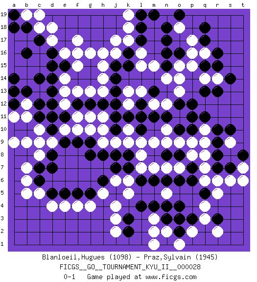 Last move : 0-1 2010 November 3 2:22:5 [Event "FICGS__GO__TOURNAMENT_KYU_II__000028"] [Site "FICGS"] [Date "2010.10.19"] [Round "1"] [Black "Blanloeil,Hugues"] [White "Praz,Sylvain"] [Result "0-1"] [Rating 1 "1098"] [Rating 2 "1945"] 1.q17 d4 2.d16 q4 3.r15 k17 4.n17 f17 5.c14 d18 6.c17 f15 7.d11 r6 8.c6 f4 9.l4 j4 10.o4 p2 11.r3 q3 12.r10 m3 13.k3 j3 14.k2 j2 15.n3 n2 16.o2 o1 17.o3 m2 18.m4 n5 19.n4 k6 20.l6 l7 21.m6 m7 22.n6 n7 23.o6 o7 24.p6 q8 25.k7 k5 26.p7 p8 27.j7 c5 28.j15 h16 29.o8 o9 30.s7 s6 31.r8 q7 32.p12 c9 33.d8 c8 34.d7 b6 35.g14 d9 36.e9 e10 37.f9 f10 38.g9 g10 39.n8 m9 40.d10 h9 41.h8 h10 42.g8 k9 43.k8 l8 44.e5 e4 45.g5 g4 46.d5 b5 47.c7 b7 48.f5 l15 49.n15 e13 50.d13 e12 51.j13 l13 52.l10 l9 53.l12 m12 54.m11 k12 55.l11 k13 56.g15 g16 57.f14 e14 58.e15 f16 59.e11 f11 60.f12 f13 61.g12 g13 62.h12 h13 63.j12 h15 64.j10 j9 65.j11 n14 66.n11 o15 67.o16 m15 68.n16 o14 69.j14 h14 70.k16 l16 71.l17 j17 72.l18 n12 73.o12 q14 74.q13 r14 75.r13 p16 76.q15 p15 77.s14 q16 78.r16 p17 79.q18 o18 80.n18 n19 81.m19 o11 82.o10 n9 83.d12 q10 84.p10 s9 85.r9 b11 86.b10 b9 87.a10 c10 88.c11 b12 89.b13 a9 90.d14 c18 91.b18 d17 92.b16 k18 93.o19 t7 94.r7 q6 95.t8 t6 96.s10 q9 97.q11 j16 98.k15 k10 99.k11 e16 100.d15 h5 101.h6 b19 102.a18 a13 103.a14 a11 104.c12 j6 105.j8 k19 106.l19 p9 107.a19 c19 108.p3 r2 109.q5 r5 110.a12 o13 111.m13 a13 112.n1 m1 113.a12 g11 114.a13 n10 115.p11 h11 116.pass pass 117.pass pass 0-1 Here are the names of the openings (joseki) played in the four corners : Corner d16 : d16 f17 Hoshi (Hwajeom, Seongjeom, Xingwei`) 4-4 Point. The star or hoshi (4-4) point, emphasizing influence at the potential expense of territory. Ikken Kakari (Hankan Keolch'im, Yi Gua`jiao~, 1-Space Low Approach). White 2 is the standard approach move to the 4-4. Corner d4 : d4 c6 Hoshi (Hwajeom, Seongjeom, Xingwei`) 4-4 Point. The star or hoshi (4-4) point, emphasizing influence at the potential expense of territory. Ikken Kakari (Hankan Keolch'im, Yi Gua`jiao~, 1-Space Low Approach). Black 2 is the standard approach move to the 4-4. Player White won this Go (weiqi, baduk) game. Follow this game move after move (download)Fighting must not be the key to go, it should be reserved as your last resource. (Zhong-Pu Liu, about Weiqi) A clear conscience is usually the sign of a bad memory. (Unknown)