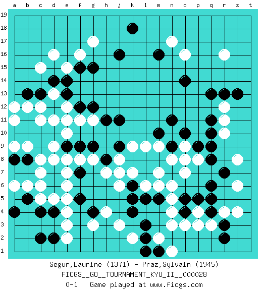 Last move : 0-1 2011 February 25 13:29:31 [Event "FICGS__GO__TOURNAMENT_KYU_II__000028"] [Site "FICGS"] [Date "2010.10.19"] [Round "1"] [Black "Segur,Laurine"] [White "Praz,Sylvain"] [Result "0-1"] [Rating 1 "1371"] [Rating 2 "1945"] 1.d4 d16 2.q4 r16 3.c13 g17 4.m16 o16 5.j16 c15 6.q10 c11 7.d12 d11 8.f12 e12 9.e13 e11 10.f15 f16 11.g15 c6 12.d8 e6 13.d6 d5 14.d7 c5 15.c4 e4 16.b5 b6 17.a4 e3 18.d2 e2 19.c2 o3 20.l3 j3 21.g4 g3 22.f5 e5 23.e9 f11 24.g12 g11 25.j11 g8 26.f7 e7 27.f9 e8 28.g9 d9 29.b8 c8 30.c9 c7 31.d10 d8 32.c10 e10 33.b11 b12 34.a10 c12 35.a8 b9 36.b10 a6 37.b13 a12 38.h11 d13 39.d14 a11 40.r7 q3 41.o4 p4 42.p5 p3 43.q6 r4 44.q5 n4 45.o5 n5 46.q13 f8 47.j9 j7 48.l8 l6 49.n7 r12 50.r13 r10 51.q11 r11 52.q9 s8 53.s13 s6 54.r3 s4 55.r2 n3 56.o14 n17 57.k18 e15 58.e14 a9 59.h8 h7 60.k4 h4 61.l5 m6 62.k6 k7 63.l7 m2 64.m5 j6 65.k5 n6 66.l2 k2 67.m1 n1 68.l1 m7 69.m8 o7 70.o8 n8 71.n9 p8 72.p9 o9 73.o10 o8 74.q8 m9 75.m10 n10 76.n11 l9 77.k8 k9 78.n9 j8 0-1 Here are the names of the openings (joseki) played in the four corners : Corner d16 : d16 c13 Hoshi (Hwajeom, Seongjeom, Xingwei`) 4-4 Point. The star or hoshi (4-4) point, emphasizing influence at the potential expense of territory. Niken Kakari (Dukan Keolch'im, E`r Gua`jiao~, 2-Space Low Approach). White typically answers by 7-3 or 3-5 (which is not joseki). Corner q16 : r16 m16 Komoku (Somok, Xiao~mu`) 3-4 Point. The komoku (3-4) point is the traditional corner enclosure move.. Corner d4 : d4 c6 Hoshi (Hwajeom, Seongjeom, Xingwei`) 4-4 Point. The star or hoshi (4-4) point, emphasizing influence at the potential expense of territory. Ikken Kakari (Hankan Keolch'im, Yi Gua`jiao~, 1-Space Low Approach). White 2 is the standard approach move to the 4-4. Corner q4 : q4 o3 Hoshi (Hwajeom, Seongjeom, Xingwei`) 4-4 Point. The star or hoshi (4-4) point, emphasizing influence at the potential expense of territory. Ikken Kakari (Hankan Keolch'im, Yi Gua`jiao~, 1-Space Low Approach). White 2 is the standard approach move to the 4-4. Player White won this Go (weiqi, baduk) game. Follow this game move after move (download)Good moves and bad moves are bedfellows. (Anonymous) The man who strikes first admits that his ideas have given out. (Chinese proverb)