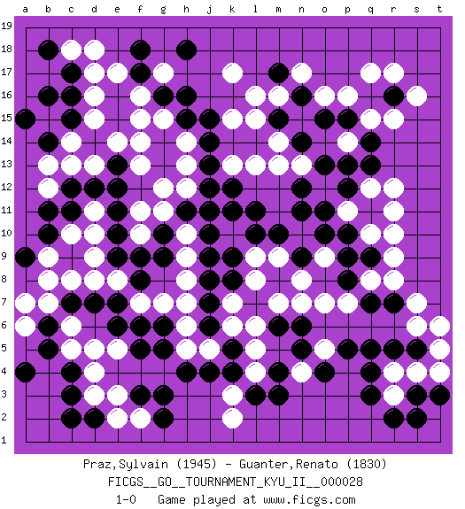 Last move : 1-0 2011 January 14 14:43:27 [Event "FICGS__GO__TOURNAMENT_KYU_II__000028"] [Site "FICGS"] [Date "2010.10.19"] [Round "1"] [Black "Praz,Sylvain"] [White "Guanter,Renato"] [Result "1-0"] [Rating 1 "1945"] [Rating 2 "1830"] 1.r16 d16 2.q4 p16 3.q14 d4 4.f17 k17 5.d14 f16 6.g16 f15 7.c17 d17 8.c16 d15 9.c15 g15 10.h16 k15 11.h15 h14 12.g14 f13 13.g13 f14 14.j14 h13 15.j13 g12 16.j15 c18 17.b18 d18 18.c12 q17 19.n16 r17 20.n14 n17 21.m17 p14 22.q13 m16 23.o15 o16 24.m15 l16 25.p15 s16 26.f3 c6 27.l3 r9 28.r7 r12 29.q11 r11 30.q9 q10 31.p10 r10 32.p9 q12 33.p12 p11 34.o11 r15 35.q3 l13 36.l11 o12 37.p13 q15 38.n11 n13 39.n12 l15 40.k12 k13 41.j12 m14 42.o13 m13 43.f5 k3 44.k4 l4 45.m3 r8 46.q7 q8 47.p8 p7 48.k5 o7 49.n9 m7 50.k8 k7 51.j7 l8 52.k9 k6 53.j6 l5 54.n5 n4 55.m4 l6 56.n6 n7 57.p5 l9 58.l10 o5 59.o4 j5 60.j4 h5 61.h4 k10 62.j10 o9 63.o10 m9 64.m10 n8 65.m6 s7 66.r5 s6 67.s5 t5 68.c9 h7 69.j8 h6 70.g5 s4 71.s3 r4 72.q5 h8 73.k11 f7 74.c3 d3 75.d2 e2 76.c2 e3 77.b5 c5 78.b6 f2 79.g3 k2 80.g2 b7 81.c7 c8 82.d7 b8 83.c4 e5 84.e6 d5 85.f6 d8 86.e7 a6 87.a4 e8 88.f8 g7 89.g9 h9 90.g10 h10 91.h11 g11 92.e9 d9 93.e10 d10 94.e11 d11 95.e12 h12 96.j11 d13 97.e13 e14 98.d12 c14 99.b14 b15 100.b16 b13 101.a15 c13 102.b11 b12 103.c11 c10 104.b10 b9 105.j9 a7 106.a9 f11 107.g6 e17 108.h18 g17 109.f18 r3 110.r2 t4 111.t3 t6 112.s2 f10 113.f9 1-0 Here are the names of the openings (joseki) played in the four corners : Corner q16 : r16 p16 Komoku (Somok, Xiao~mu`) 3-4 Point. The komoku (3-4) point is the traditional corner enclosure move.. Ikken Takagakari (Hankan Nop'dakeolch'im, Yi Gaogua`jiao~, 1-Space High Approach). The 5-4 approach move has become more popular in modern times, as modern Go emphasizes speed and influence. Corner d16 : d16 f17 Hoshi (Hwajeom, Seongjeom, Xingwei`) 4-4 Point. The star or hoshi (4-4) point, emphasizing influence at the potential expense of territory. Ikken Kakari (Hankan Keolch'im, Yi Gua`jiao~, 1-Space Low Approach). Black 2 is the standard approach move to the 4-4. Corner d4 : d4 f3 Hoshi (Hwajeom, Seongjeom, Xingwei`) 4-4 Point. The star or hoshi (4-4) point, emphasizing influence at the potential expense of territory. Ikken Kakari (Hankan Keolch'im, Yi Gua`jiao~, 1-Space Low Approach). Black 2 is the standard approach move to the 4-4. Player Black won this Go (weiqi, baduk) game. Follow this game move after move (download)The nature of a game comes from what is played, but it's the sensitivity to the possible and the impossible that gives it value. (Pierre Audouard) Lamb in skin of tiger, still fears the wolf. (Chinese proverb)