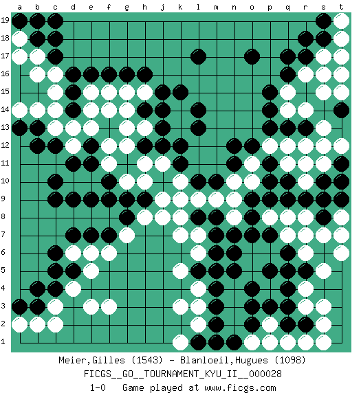 Last move : 1-0 2010 November 13 10:25:23 [Event "FICGS__GO__TOURNAMENT_KYU_II__000028"] [Site "FICGS"] [Date "2010.10.19"] [Round "1"] [Black "Meier,Gilles"] [White "Blanloeil,Hugues"] [Result "1-0"] [Rating 1 "1543"] [Rating 2 "1098"] 1.q16 d4 2.d16 r4 3.c6 f3 4.c9 r10 5.l17 r14 6.o17 k3 7.p3 n3 8.p5 r6 9.p7 q8 10.n6 m5 11.n5 n4 12.o4 c14 13.c12 e14 14.f16 g14 15.h16 l7 16.m6 l6 17.m4 l4 18.m3 l3 19.m2 l2 20.l5 k5 21.l14 b16 22.c17 s16 23.r17 e6 24.p14 q12 25.k12 f11 26.f9 g7 27.h9 h11 28.f13 g13 29.e12 f14 30.j10 e10 31.e9 d10 32.c10 d12 33.d11 d13 34.e11 f12 35.f10 e13 36.d9 b17 37.r2 s3 38.b4 c3 39.b3 b2 40.o12 o10 41.n11 n10 42.m10 j8 43.p9 n8 44.p10 p8 45.o9 n9 46.o8 l9 47.m8 m9 48.l10 k9 49.m7 k10 50.k11 o11 51.n12 j14 52.k15 k13 53.l13 j11 54.j13 k14 55.h14 h13 56.j15 h10 57.g8 h8 58.f7 f6 59.e7 d6 60.d7 s17 61.s18 t18 62.r18 s2 63.q3 r3 64.l8 k8 65.q9 r8 66.r9 s9 67.r11 q11 68.s10 s11 69.s8 s7 70.t9 r12 71.q6 r7 72.d5 e5 73.c5 e3 74.c4 c2 75.b13 b14 76.q13 q14 77.p13 q15 78.r13 s13 79.p15 s15 80.b18 a18 81.c18 n2 82.m1 m5 83.n1 o1 84.l5 p2 85.q2 m5 86.r5 s5 87.l5 q1 88.m5 r1 89.p11 p12 90.n7 k7 91.q10 r11 92.t11 s12 93.t14 t12 94.t10 t15 95.t17 r16 96.o3 p1 97.o2 s1 98.l1 k1 99.g11 g10 100.g9 t8 101.t7 t6 102.h12 j9 103.j12 g12 104.o7 t16 105.q17 g15 106.g16 a2 107.a3 a14 108.a13 c13 109.b12 c16 110.d15 c15 111.q5 e15 112.e16 h15 113.j14 t8 114.s9 t7 115.q4 t19 116.s19 t17 117.a19 b19 118.c19 a17 119.a19 q7 120.b19 f15 121.d14 1-0 Here are the names of the openings (joseki) played in the four corners : Corner d4 : d4 c6 Hoshi (Hwajeom, Seongjeom, Xingwei`) 4-4 Point. The star or hoshi (4-4) point, emphasizing influence at the potential expense of territory. Ikken Kakari (Hankan Keolch'im, Yi Gua`jiao~, 1-Space Low Approach). Black 2 is the standard approach move to the 4-4. Corner q4 : r4 p3 Komoku (Somok, Xiao~mu`) 3-4 Point. The komoku (3-4) point is the traditional corner enclosure move.. Ikken Kakari (Hankan Keolch'im, Yi Gua`jiao~, 1-Space Low Pincer). The small knight move is the basic approach move to the 3-4 point stone. It has been continually used for over four centuries. There are limitless variations, with new moves constantly being discovered. Black 2 opens the door to a treaure store of joseki. Corner d16 : d16 c14 Hoshi (Hwajeom, Seongjeom, Xingwei`) 4-4 Point. The star or hoshi (4-4) point, emphasizing influence at the potential expense of territory. Ikken Kakari (Hankan Keolch'im, Yi Gua`jiao~, 1-Space Low Approach). White 2 is the standard approach move to the 4-4. Player Black won this Go (weiqi, baduk) game. Follow this game move after move (download)For rectangular six in the corner, dame is necessary. (Anonymous) A journey of a thousand sites begins with a single click. (Author unknown)
