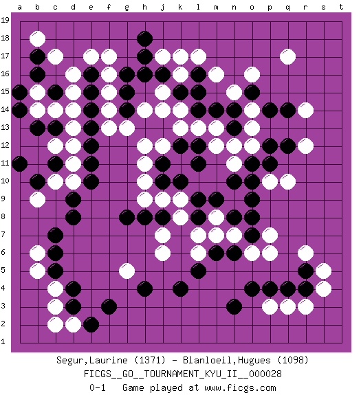 Last move : 0-1 2011 February 5 19:38:25 [Event "FICGS__GO__TOURNAMENT_KYU_II__000028"] [Site "FICGS"] [Date "2010.10.19"] [Round "1"] [Black "Segur,Laurine"] [White "Blanloeil,Hugues"] [Result "0-1"] [Rating 1 "1371"] [Rating 2 "1098"] 1.d4 q17 2.q4 d16 3.c13 k16 4.k4 q10 5.d8 r6 6.p14 r14 7.q12 r12 8.n3 p6 9.g16 f17 10.h17 k17 11.e16 e17 12.b16 c17 13.b17 d15 14.e15 d14 15.e14 d13 16.c11 o16 17.n14 m16 18.l14 j14 19.k15 j15 20.j16 j17 21.h16 k14 22.l15 f16 23.g14 f15 24.g15 f14 25.e13 f13 26.e12 h12 27.h13 j12 28.j13 k13 29.k12 l13 30.l12 m13 31.m14 n12 32.p11 p10 33.o11 n11 34.n13 m12 35.j11 h11 36.k10 h10 37.n10 g13 38.h18 h14 39.l16 l17 40.o10 s4 41.r5 s5 42.l8 d12 43.e11 p3 44.p4 q3 45.r4 r3 46.o4 c3 47.d3 c4 48.c5 d2 49.e2 c2 50.f3 b5 51.c6 b6 52.c7 j6 53.h8 l6 54.n6 m7 55.n8 n7 56.o7 m8 57.m9 o6 58.m6 l7 59.o9 p7 60.o8 k8 61.l9 j9 62.l11 o12 63.p12 o13 64.q14 o14 65.o15 n15 66.j10 h9 67.j8 k9 68.g8 g5 69.l5 j7 70.h4 d11 71.e10 d10 72.d9 c10 73.b13 b18 74.b10 b9 75.a11 b15 76.c15 c14 77.a15 b14 78.a14 c12 0-1 Here are the names of the openings (joseki) played in the four corners : Corner d16 : d16 c13 Hoshi (Hwajeom, Seongjeom, Xingwei`) 4-4 Point. The star or hoshi (4-4) point, emphasizing influence at the potential expense of territory. Niken Kakari (Dukan Keolch'im, E`r Gua`jiao~, 2-Space Low Approach). White typically answers by 7-3 or 3-5 (which is not joseki). Corner q4 : q4 r6 Hoshi (Hwajeom, Seongjeom, Xingwei`) 4-4 Point. The star or hoshi (4-4) point, emphasizing influence at the potential expense of territory. Ikken Kakari (Hankan Keolch'im, Yi Gua`jiao~, 1-Space Low Approach). White 2 is the standard approach move to the 4-4. Corner q16 : q17 p14 Komoku (Somok, Xiao~mu`) 3-4 Point. The komoku (3-4) point is the traditional corner enclosure move.. Player White won this Go (weiqi, baduk) game. Follow this game move after move (download)Good moves and bad moves are bedfellows. (Anonymous) The only difference between a tax man and a taxidermist is that the taxidermist leaves the skin. (Mark Twain)