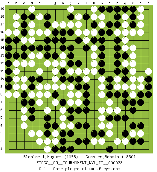 Last move : 0-1 2011 February 5 19:14:24 [Event "FICGS__GO__TOURNAMENT_KYU_II__000028"] [Site "FICGS"] [Date "2010.10.19"] [Round "1"] [Black "Blanloeil,Hugues"] [White "Guanter,Renato"] [Result "0-1"] [Rating 1 "1098"] [Rating 2 "1830"] 1.q3 d16 2.q16 d3 3.d5 d8 4.f4 c4 5.h3 c5 6.d6 c6 7.l4 r9 8.r6 r14 9.o16 k17 10.c14 c12 11.e14 f16 12.e12 c10 13.p14 s16 14.r17 s17 15.q8 r8 16.q7 q12 17.m17 l15 18.f7 f2 19.c17 d17 20.c16 d15 21.d14 c15 22.b15 o4 23.n3 o3 24.q5 n2 25.m3 m2 26.l2 q2 27.r2 p2 28.o1 r3 29.r4 p6 30.p5 n5 31.o5 n4 32.l6 n6 33.o8 n8 34.l8 o7 35.o9 n9 36.o10 n10 37.n11 l10 38.k9 m11 39.n12 m12 40.n13 m13 41.h15 g14 42.j14 h13 43.j13 h12 44.j12 j11 45.h11 k11 46.g15 g11 47.h10 g10 48.e10 h9 49.j10 j9 50.k10 e9 51.d10 f9 52.d9 c9 53.g8 g9 54.e8 k8 55.l9 k7 56.l7 f8 57.d7 e7 58.c8 e8 59.c7 d12 60.f15 h17 61.k12 l11 62.l14 e11 63.f13 f12 64.g13 e13 65.h14 g12 66.f14 g3 67.g4 h4 68.f3 g2 69.j3 j4 70.j5 h5 71.j6 h6 72.h7 f6 73.k6 g7 74.k4 j8 75.h2 e3 76.k2 m14 77.m15 l16 78.n14 q9 79.p8 b14 80.b13 b16 81.a14 b17 82.c13 m16 83.n15 r16 84.r18 q15 85.p15 q17 86.p17 q18 87.p18 p16 88.q19 q16 89.f5 j7 90.a10 b10 91.a9 b8 92.g16 g17 93.c18 b18 94.d18 e18 95.l18 k18 96.f17 e16 97.f18 d19 98.j18 j19 99.q13 r13 100.q11 r11 101.q10 r10 102.p12 r12 103.s7 n17 104.o17 n18 105.n16 m18 106.t10 s10 107.t9 t11 108.s8 s18 109.r19 h1 110.j1 e2 111.g1 s3 112.s2 o6 113.s4 s9 114.t8 p10 115.p11 p9 116.r7 q14 117.p13 s19 118.p19 f1 119.h1 a16 120.a15 b12 121.a12 a8 122.a11 b11 123.j16 j17 124.k15 k16 125.h16 d13 126.n19 m19 127.o19 b9 128.a13 pass 0-1 Here are the names of the openings (joseki) played in the four corners : Corner d4 : d3 d5 Komoku (Somok, Xiao~mu`) 3-4 Point. The komoku (3-4) point is the traditional corner enclosure move.. Ikken Takagakari (Hankan Nop'dakeolch'im, Yi Gaogua`jiao~, 1-Space High Approach). The 5-4 approach move has become more popular in modern times, as modern Go emphasizes speed and influence. Corner q16 : q16 r14 Hoshi (Hwajeom, Seongjeom, Xingwei`) 4-4 Point. The star or hoshi (4-4) point, emphasizing influence at the potential expense of territory. Ikken Kakari (Hankan Keolch'im, Yi Gua`jiao~, 1-Space Low Approach). White 2 is the standard approach move to the 4-4. Corner d16 : d16 c14 Hoshi (Hwajeom, Seongjeom, Xingwei`) 4-4 Point. The star or hoshi (4-4) point, emphasizing influence at the potential expense of territory. Ikken Kakari (Hankan Keolch'im, Yi Gua`jiao~, 1-Space Low Approach). Black 2 is the standard approach move to the 4-4. Player White won this Go (weiqi, baduk) game. Follow this game move after move (download)Territory really exists only in the end. (Pierre Audouard) Optimism is a variety of information deficit. Sometimes especially true for correspondence chess games. (Michael Aigner)