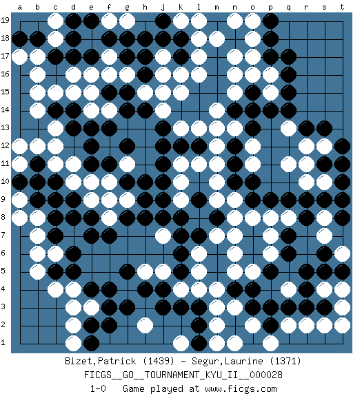Last move : 1-0 2011 November 10 23:53:25 [Event "FICGS__GO__TOURNAMENT_KYU_II__000028"] [Site "FICGS"] [Date "2010.10.19"] [Round "1"] [Black "Bizet,Patrick"] [White "Segur,Laurine"] [Result "1-0"] [Rating 1 "1439"] [Rating 2 "1371"] 1.q16 d4 2.q3 d16 3.r9 e10 4.c10 c13 5.c7 b12 6.e7 d11 7.f4 b5 8.j4 k16 9.h8 o16 10.q14 p6 11.r5 f8 12.f7 e3 13.o9 n6 14.m8 l6 15.k8 l4 16.o4 n3 17.n4 m3 18.k3 o2 19.m5 l5 20.m6 q2 21.p3 r2 22.r3 s2 23.m16 n15 24.l15 m14 25.k14 m12 26.k12 m10 27.o13 n9 28.o10 n8 29.l7 k10 30.j10 l11 31.l9 k9 32.j9 o17 33.q17 m18 34.m17 l18 35.n18 n17 36.p18 o18 37.n14 l13 38.m15 n13 39.o14 k13 40.j13 j14 41.j12 k15 42.l14 m13 43.k17 l17 44.n10 m9 45.o7 n7 46.o6 n5 47.p2 p1 48.f3 b7 49.c8 m7 50.d17 e16 51.c17 b15 52.f18 b17 53.b18 a17 54.a18 b16 55.e4 d2 56.d5 c4 57.h14 j15 58.g14 f14 59.f13 s4 60.s3 t3 61.s5 t4 62.e13 e14 63.h17 g16 64.k6 o5 65.p5 p7 66.q6 q4 67.r4 o8 68.q7 q8 69.p9 p8 70.r8 m4 71.o15 n16 72.d13 c12 73.f11 f10 74.g10 g9 75.e11 d10 76.d9 e9 77.e8 b10 78.b9 n1 79.l2 r12 80.r13 q11 81.q9 o11 82.n11 o12 83.n12 s7 84.s6 s8 85.s9 t6 86.t5 t9 87.t10 s10 88.t8 q13 89.s13 p15 90.p14 p16 91.q15 t11 92.t9 r10 93.s11 s12 94.t12 r11 95.t11 t2 96.k18 j17 97.j18 j16 98.e2 d3 99.e1 d1 100.f2 c6 101.d6 b8 102.b11 c11 103.a10 a12 104.c5 b6 105.d14 d15 106.c14 b14 107.g17 f17 108.e17 f16 109.o3 m2 110.k5 a8 111.l3 k4 112.j3 h5 113.g8 f9 114.h9 g11 115.h10 f12 116.e12 c15 117.p17 o19 118.p19 n19 119.f15 e15 120.g15 h15 121.g12 k11 122.l12 m11 123.j11 j7 124.k7 j5 125.j8 h2 126.h4 k1 127.l1 g4 128.g3 a11 129.b10 a9 130.c9 d7 131.d8 f19 132.e19 g19 133.g18 k19 134.j19 l19 135.h16 l16 136.h18 m1 137.g5 c18 138.d18 c19 139.d19 1-0 Here are the names of the openings (joseki) played in the four corners : Corner d4 : d4 c7 Hoshi (Hwajeom, Seongjeom, Xingwei`) 4-4 Point. The star or hoshi (4-4) point, emphasizing influence at the potential expense of territory. Niken Kakari (Dukan Keolch'im, E`r Gua`jiao~, 2-Space Low Approach). White typically answers by 7-3 or 3-5 (which is not joseki). Corner q16 : q16 o16 Hoshi (Hwajeom, Seongjeom, Xingwei`) 4-4 Point. The star or hoshi (4-4) point, emphasizing influence at the potential expense of territory. Ikken Takagakari (Hankan Nop'dakeolch'im, Yi Gaojia, 1-Space High Approach). Black typically responds at 6-4 or 3-10. Black 4-10 is played when Black finds play on the right side advantageous. Black 4-8 or 3-8 may be played when Black has support at top. Player Black won this Go (weiqi, baduk) game. Follow this game move after move (download)The carpenter's square becomes ko. (Anonymous) The modern world has divided itself into Conservatives and Progressives. The business of Progressives is to go on making mistakes. The business of the Conservatives is to prevent the mistakes from being corrected. (G.K. Chesterton)