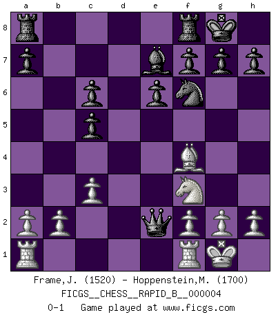 Last move : 0-1 2006 May 8 0:43:28 [Event "FICGS__CHESS__RAPID_B__000004"] [Site "FICGS"] [Date "2006.04.30"] [Round "1"] [White "Frame,Jeremy"] [Black "Hoppenstein,Michael"] [Result "0-1"] [WhiteElo "1520"] [BlackElo "1700"] 1.e4 c5 2.Nf3 d6 3.c3 Nf6 4.e5 dxe5 5.Nxe5 Nc6 6.Nxc6 bxc6 7.Bc4 Bf5 8.O-O e6 9.d3 Be7 10.Bf4 O-O 11.Nd2 Bxd3 12.Bxd3 Qxd3 13.Nf3 Qa6 14.Qe2 Qxe2 0-1 Sicilian Kingside Castling by player White (move 8) Kingside Castling by player Black (move 10) Player Black won this chess game. Follow this game move after move (download)The battle for the ultimate truth will never be won. And that's why Chess is so fascinating. (Hans Kmoch) Die starken Figuren des Gegners muss man abtauschen. (José Raúl Capablanca) El jugador de combinación piensa hacia adelante; comienza de la posición dada y trabaja las movidas contundentes en su mente. (Emanuel Lasker) Dans le domaine de la peinture, de la gravure et de la sculpture, dès la première décennie de notre siècle, les artistes abandonnent la représentation de la partie d'échecs pour se concentrer sur les pièces, sur les échiquiers et sur toutes les variations auxquelles les unes et les autres peuvent donner lieu. On passe en quelque sorte d'un thème social à un thème musical (au sens de la musica médiévale, c'est-à-dire d'une notion qui inclue le rythme, l'harmonie, la construction et la déconstruction, etc.). Graphiquement et picturalement, l'échiquier apparaît comme une structure ouverte, dynamique, d'une richesse infinie, autorisant toutes les combinatoires et débouchant sur des mouvements et des rythmes de nature exponentielle. (Michel Pastoureau) Creativity is inventing, experimenting, growing, taking risks, breaking rules, making mistakes, and having fun. (Mary Lou Cook)