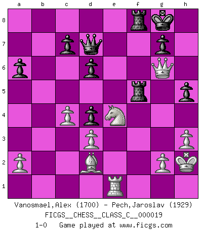 Last move : 1-0 2007 March 3 19:28:44 [Event "FICGS__CHESS__CLASS_C__000019"] [Site "FICGS"] [Date "2006.11.27"] [Round "1"] [White "Vanosmael,Alex"] [Black "Pech,Jaroslav"] [Result "1-0"] [WhiteElo "1700"] [BlackElo "1929"] 1.c4 e5 2.Nc3 Nc6 3.Nf3 f5 4.e4 Nf6 5.exf5 Bc5 6.Bd3 O-O 7.O-O d6 8.b3 Ng4 9.h3 Nxf2 10.Rxf2 Bxf2+ 11.Kxf2 Bxf5 12.Bxf5 Rxf5 13.Kg1 Nd4 14.Nxd4 exd4 15.Ne4 Qe7 16.d3 Raf8 17.Bd2 Qf7 18.Qg4 a6 19.Kh2 b5 20.Re1 h5 21.Qg3 bxc4 22.bxc4 Qd7 23.Qg6 1-0 English : Three knights system Kingside Castling by player Black (move 6) Kingside Castling by player White (move 7) Player White won this chess game. Follow this game move after move (download)Play the opening like a book, the middle game like a magician, and the endgame like a machine. (Spielmann) Alle Schachspieler sollten auch ein Hobby haben. (Savielly Grigorievitsch Tartakower) El hombre es un frívolo, una creatura engañosa y como un jugador de Ajedrez, se preocupa mas por el proceso de obtener su meta que de la meta por sí misma. (Dostoyevsky) Nous vivons dans un monde échiquéen : chaque jour qui passe est un défi à relever. (Philosophe Sasha) The message for business people contemplating their place in the cyberspace is simple and direct: get linked or get lost. (Vic Sussman and Kenan Pollack)