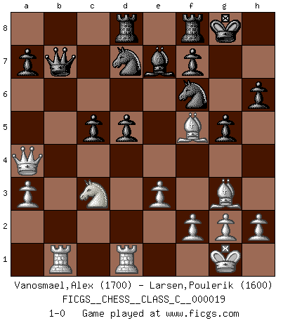 Last move : 1-0 2007 April 15 11:9:8 [Event "FICGS__CHESS__CLASS_C__000019"] [Site "FICGS"] [Date "2006.11.27"] [Round "1"] [White "Vanosmael,Alex"] [Black "Larsen,Poulerik"] [Result "1-0"] [WhiteElo "1700"] [BlackElo "1600"] 1.c4 Nf6 2.Nc3 e6 3.d4 d5 4.cxd5 exd5 5.Bg5 Be7 6.e3 O-O 7.Bd3 Nbd7 8.Qc2 b6 9.Nge2 c5 10.O-O Bb7 11.dxc5 bxc5 12.Rfd1 h6 13.Bh4 Qb6 14.Rac1 Bc6 15.Bf5 Rad8 16.a3 Qb7 17.Na4 Bxa4 18.Qxa4 g5 19.Bg3 Qxb2 20.Nc3 Qb7 21.Rb1 1-0 This chess game has been lost on time (started : 2006.11.27 5:12:45) English Opening Kingside Castling by player Black (move 6) Kingside Castling by player White (move 10) Player White won this chess game. Follow this game move after move (download)Fischer prefers to enter Chess history alone. (Miguel Najdorf) Fischer: 'Remis!?' Uhlmann: 'Aber es muss doch dreimal Zugwiederholung sein!' Fischer: 'Sie nehmen das Remis an, wie ich es sage, sonst spiele ich weiter und werde Sie dann schlagen!' (Robert James Fischer) El muchacho (en ese entonces un niño de 12 años llamado Anatoly Karpov) no tiene ni idea de lo que es el Ajedrez y no hay futuro en absoluto para el en esta profesión. (Mikhail Botvinnik) Les réformistes prétendent que les progrès de la théorie conduiront à la disparition des échecs, et qu'il faut, pour leur rendre vie, en remanier les règles. En réalité, qu'exprime cette affirmation? Le mépris de l'intuition, de l'imagination et de tous les autres éléments qui font des échecs un art. (Alexander Alekhine) Luck is when opportunity knocks and you answer. (Anonymous)