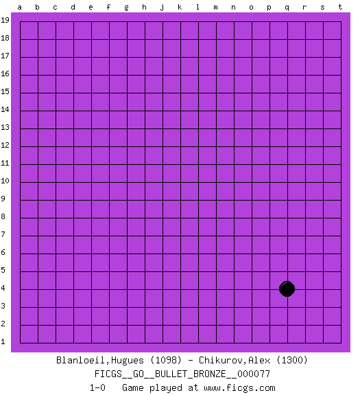 Last move : 1-0 2010 October 23 22:14:3 [Event "FICGS__GO__BULLET_BRONZE__000077"] [Site "FICGS"] [Date "2010.10.23"] [Round "1"] [Black "Blanloeil,Hugues"] [White "Chikurov,Alex"] [Result "1-0"] [Rating 1 "1098"] [Rating 2 "1300"] 1.q4 1-0 This go game has been lost on time (started : 2010.10.23 19:52:43) Here are the names of the openings (joseki) played in the four corners : Corner q4 : q4 1-0 Hoshi (Hwajeom, Seongjeom, Xingwei`) 4-4 Point. The star or hoshi (4-4) point, emphasizing influence at the potential expense of territory. Player Black won this Go (weiqi, baduk) game. Follow this game move after move (download)Six eyes in a rectangle are alive. (Anonymous) Unless I accept my faults I will most certainly doubt my virtues. (Hugh Prather)