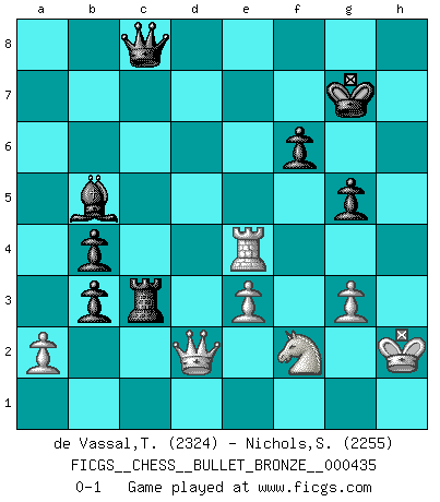 Last move : 0-1 2010 October 23 21:24:6 [Event "FICGS__CHESS__BULLET_BRONZE__000435"] [Site "FICGS"] [Date "2010.10.23"] [Round "1"] [White "de Vassal,Thibault"] [Black "Nichols,Scott"] [Result "0-1"] [WhiteElo "2324"] [BlackElo "2255"] 1.Nf3 Nf6 2.d4 d5 3.c4 c6 4.Nc3 e6 5.e3 Nbd7 6.Bd3 dxc4 7.Bxc4 b5 8.Bd3 Bd6 9.O-O O-O 10.b3 Bb7 11.Bb2 b4 12.Na4 c5 13.Qe2 cxd4 14.Nxd4 Rc8 15.Rfd1 Qe7 16.Bc4 Ne5 17.Bb5 Ne4 18.f4 Nd7 19.Rac1 Ndc5 20.Nxc5 Bxc5 21.Bc4 Rfd8 22.Nb5 Rxd1+ 23.Rxd1 g6 24.Rc1 Rd8 25.Bd3 a6 26.Bxe4 Bxe4 27.Bd4 Bxd4 28.Nxd4 e5 29.fxe5 Qxe5 30.Qf2 a5 31.Qh4 Rd5 32.Rc8+ Kg7 33.Qf2 Bd3 34.h3 h6 35.Nf3 Qa1+ 36.Kh2 Qf6 37.Re8 Qd6+ 38.g3 Bb5 39.Qb2+ f6 40.Re4 Bc6 41.Nd4 Bd7 42.h4 g5 43.Nf3 Rc5 44.Qf2 Bc6 45.Rd4 Qe6 46.Ne1 Rc3 47.Nd3 Bb5 48.Qd2 a4 49.hxg5 hxg5 50.Nf2 axb3 51.Re4 Qc8 0-1 Reti Opening Kingside Castling by player White (move 9) Kingside Castling by player Black (move 9) Player Black won this chess game. Follow this game move after move (download)Pawns are born free, yet they are everywhere in chains. (Rick Kennedy) Gott hat gewollt, dass ich Champion werde. (Surab Azmajparaschvili) Botvinnik trataba de restarle el misterio al Ajedrez, siempre relacionandolo a situaciones de la vida ordinaria. El gustaba de llamar al Ajedrez un típico problema inexacto similar a aquellos de los cuales la gente siempre tiene que enfrentarse en la vida cotidiana. (Garry Kasparov) A chaque perte on perd un peu de soi. (Joël Lautier) There are 10 types of people in this world: those who understand binary and those who don't. (Anonymous)