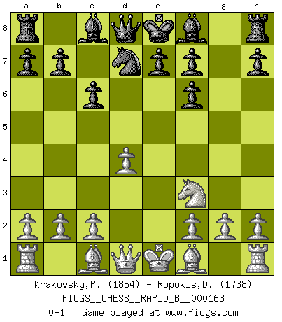 Last move : 0-1 2010 December 11 10:26:21 [Event "FICGS__CHESS__RAPID_B__000163"] [Site "FICGS"] [Date "2010.10.24"] [Round "1"] [White "Krakovsky,Peter"] [Black "Ropokis,Dimitrios"] [Result "0-1"] [WhiteElo "1854"] [BlackElo "1738"] 1.e4 c6 2.d4 d5 3.Nc3 dxe4 4.Nxe4 Nf6 5.Nxf6+ gxf6 6.Nf3 Nd7 0-1 This chess game has been lost on time (started : 2010.10.24 1:52:31) Caro-Kann : Bronstein-Larsen variation Player Black won this chess game. Follow this game move after move (download)First-class players lose to second class players because second-class players sometimes play a first-class game. (Tarrasch) Ich verstehe den Grund nicht, warum die Aufteilung in Frauen und Männer überhaupt im Schach besteht. (Judith Polgar) Los asuntos humanos son como una partida de Ajedrez: solo aquellos que no lo toman seriamente, pueden ser llamados buenos jugadores. (Hung Tzu Ch'eng) Les ravages du H expliquent la différence de niveau entre Tal et Thal [Abergel]. To send light into the darkness of men's hearts - such is the duty of the artist. (Schumann)
