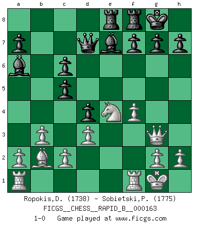 Last move : 1-0 2010 December 24 22:40:33 [Event "FICGS__CHESS__RAPID_B__000163"] [Site "FICGS"] [Date "2010.10.24"] [Round "1"] [White "Ropokis,Dimitrios"] [Black "Sobietski,Piotr"] [Result "1-0"] [WhiteElo "1738"] [BlackElo "1775"] 1.e4 c5 2.Nc3 e6 3.f4 d5 4.exd5 exd5 5.Bb5+ Nc6 6.Nf3 Nf6 7.O-O Be7 8.Ne5 Qc7 9.Qf3 O-O 10.Bxc6 bxc6 11.b3 Ba6 12.d3 Nd7 13.Nxd7 Qxd7 14.Bb2 Rae8 15.Qg3 d4 16.Ne4 1-0 This chess game has been lost on time (started : 2010.10.24 1:52:31) Sicilian : Closed Kingside Castling by player White (move 7) Kingside Castling by player Black (move 9) Player White won this chess game. Follow this game move after move (download)With or without the title, Bobby Fischer was unquestionably the greatest player of his time. (Burt Hochberg) In der Schule lernt man nichts. Es ist nur Zeitverschwendung. (Robert James Fischer) Combinaciones deslumbrantes son para la mayoría, mover madera es para los pocos. (Georg Kieninger) L'attaque fait le spectacle, la défense gagne les matchs. (Dicton footballistique) The faster the computer, the slower the brain. (Thibault de Vassal)