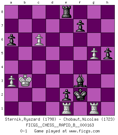 Last move : 0-1 2011 January 20 21:55:51 [Event "FICGS__CHESS__RAPID_B__000163"] [Site "FICGS"] [Date "2010.10.24"] [Round "1"] [White "Sternik,Ryszard"] [Black "Chobaut,Nicolas"] [Result "0-1"] [WhiteElo "1798"] [BlackElo "1723"] 1.e4 g6 2.d4 Bg7 3.Nc3 d6 4.f4 e6 5.Nf3 Ne7 6.Be3 b6 7.Qd2 Bb7 8.O-O-O Nd7 9.Bd3 Nf6 10.h3 O-O 11.g4 c5 12.g5 Nh5 13.Rhg1 Rc8 14.Be2 c4 15.a3 b5 16.d5 exd5 17.Nd4 dxe4 18.Ndxb5 d5 19.Bxh5 gxh5 20.Qf2 a6 21.Na7 Bxc3 22.Nxc8 Bxb2+ 23.Kxb2 Bxc8 24.Bb6 Qe8 25.Bd4 Bxh3 26.Bc3 Qb5+ 27.Ka2 Nf5 28.Qa7 Qa4 29.Kb2 Qc6 30.Ka2 Re8 31.Rb1 d4 32.Bxd4 Nxd4 33.Qxd4 e3 34.Rg3 Qe6 35.Qe5 c3 36.Ka1 Qc6 37.Qd4 e2 38.Rxc3 Qd7 39.Qxd7 Bxd7 40.Re1 h4 41.Rf3 Bg4 42.Rf2 h6 43.Rg2 h5 44.Kb2 Kg7 45.Rf2 Kg6 46.Kb3 h3 47.c4 Kf5 48.c5 h2 49.Rxh2 Kxf4 50.c6 Kg3 51.R2h1 Bf3 52.Rhg1+ Kf2 0-1 Robatsch defense : Pseudo-Austrian attack Queenside Castling by player White (move 8) Kingside Castling by player Black (move 10) Player Black won this chess game. Follow this game move after move (download)If one piece is badly posted, the whole game is bad. (Tarrasch) Vielleicht wirkt die Aura früherer Spieler glanzvoller als die der heutigen Spieler, aber das liegt daran, dass man kein Programm wie Fritz hatte, das einem all die Löcher in ihren Partien zeigt. (Vladimir Kramnik) Jugadores de primera clase pierden en contra de jugadores de segunda clase porque los jugadores de segunda clase a veces juegan una partida de primer clase. (Siegbert Tarrasch) 'L'échange des dames est un coup dur pour les deux adversaires...' Un journaliste lors d'une partie du match Spassky-Fischer Begin at the beginning and go on till you come to the end; then stop. (Lewis Carrol, Alice in Wonderland)