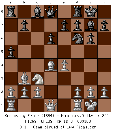 Last move : 0-1 2010 December 4 10:26:29 [Event "FICGS__CHESS__RAPID_B__000163"] [Site "FICGS"] [Date "2010.10.24"] [Round "1"] [White "Krakovsky,Peter"] [Black "Mamrukov,Dmitri"] [Result "0-1"] [WhiteElo "1854"] [BlackElo "1841"] 1.e4 c5 2.Nf3 g6 3.d4 cxd4 4.Nxd4 Nc6 5.Nc3 Bg7 6.Be3 Nf6 7.Bc4 O-O 8.Bb3 a5 9.O-O Nxd4 10.Bxd4 d6 0-1 This chess game has been lost on time (started : 2010.10.24 1:52:31) Sicilian : Hungarian variation Kingside Castling by player Black (move 7) Kingside Castling by player White (move 9) Player Black won this chess game. Follow this game move after move (download)A good player is always lucky. (Jose Raul Capablanca) Der 70jährige Viktor Kortschnoi: Die Rentenanstalt wollte mich zwingen in Rente zu gehen. Meine Frau erhält jetzt eine Pension- und ich zahle weiter in die Rentenkasse ein! (Viktor Kortschnoi) En el Ajedrez, tal como es jugado por los Maestros, practicamente la suerte es eliminada. (Emanuel Lasker) Les échecs sont un jeu par leur forme, un art par leur essence et une science par sa difficulté d'acquisition. Ils peuvent vous procurer autant de plaisir qu'un bon livre ou une belle musique, mais vous n'aurez une réelle joie que si vous arrivez à bien jouer. (Tigran Petrosian) Wikichess, chess moves explained by 'experimented' players. (Thibault de Vassal)