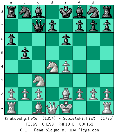 Last move : 0-1 2010 December 10 22:26:30 [Event "FICGS__CHESS__RAPID_B__000163"] [Site "FICGS"] [Date "2010.10.24"] [Round "1"] [White "Krakovsky,Peter"] [Black "Sobietski,Piotr"] [Result "0-1"] [WhiteElo "1854"] [BlackElo "1775"] 1.e4 c5 2.Nf3 e6 3.d4 cxd4 4.Nxd4 a6 5.Nc3 Qc7 6.Be2 b5 0-1 This chess game has been lost on time (started : 2010.10.24 1:52:31) Sicilian : Kan, 5.Nc3 Player Black won this chess game. Follow this game move after move (download)When I asked Fischer why he had not played a certain move in our game, he replied: 'Well, you laughed when I wrote it down !' (Mikhail Tal) Ich glaube nicht an Psychologie, ich glaube an gute Züge. (Robert James Fischer) Los tropiezos estan todos ahí en el tablero, esperando que se cometan. (Savielly Tartakover) J'ai vu le vaincu d'Echecs jouer des années durant dans l'espoir de la fête de la victoire. Car tu es plus riche de ce qu'elle existe si même elle n'est point pour toi. Ainsi de la perle du fond des mers. (Antoine de Saint-Exupéry) The absolute truth is the thing that makes people laugh. (Carl Reiner)