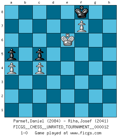 Last move : 1-0 2010 November 13 20:41:17 [Event "FICGS__CHESS__UNRATED_TOURNAMENT__000012"] [Site "FICGS"] [Date "2010.10.24"] [Round "1"] [White "Parmet,Daniel"] [Black "Riha,Josef"] [Result "1-0"] [WhiteElo "2084"] [BlackElo "2041"] 1.Nf3 f5 2.d4 e6 3.c4 Nf6 4.g3 d5 5.Bg2 c5 6.cxd5 Nxd5 7.O-O Nc6 8.Nc3 Nxd4 9.Nxd4 Nxc3 10.bxc3 cxd4 11.Qa4+ Bd7 12.Qxd4 Bc6 13.Bxc6+ bxc6 14.Qa4 Qc7 15.e4 fxe4 16.Qxe4 e5 17.Be3 Bd6 18.Qc4 Rf8 19.Rad1 Rd8 20.Rfe1 g6 21.Bg5 Be7 22.Rxd8+ Qxd8 23.Rxe5 Qd1+ 24.Kg2 Qf3+ 25.Kh3 Qh5+ 26.Qh4 Qxh4+ 27.Kxh4 Rf7 28.Rxe7+ Rxe7 29.Bxe7 Kxe7 30.Kg5 Kf7 31.Kh6 Kg8 32.h4 Kh8 33.f4 Kg8 34.g4 Kh8 35.h5 gxh5 36.Kxh5 Kg7 37.g5 Kf7 38.Kh6 Kg8 39.g6 hxg6 40.Kxg6 Kf8 41.Kf6 Ke8 42.Ke6 Kf8 43.f5 Ke8 44.f6 Kf8 45.f7 c5 46.c4 a6 47.a3 a5 48.a4 1-0 Reti v Dutch Kingside Castling by player White (move 7) 10 pieces endgame at move 35 : White KPPPP , Black KPPPP WHITE : King + 4 Pawns BLACK : King + 4 Pawns 9 pieces endgame at move 36 : White KPPPP , Black KPPP WHITE : King + 4 Pawns BLACK : King + 3 Pawns 8 pieces endgame at move 39 : White KPPP , Black KPPP WHITE : King + 3 Pawns BLACK : King + 3 Pawns 7 pieces endgame at move 40 : White KPPP , Black KPP WHITE : King + 3 Pawns BLACK : King + 2 Pawns Player White won this chess game. Follow this game move after move (download)A chess genius has died; a loss for humanity. (Viktor Kortchnoi, about Bobby Fischer's death) Meine Liebe ist Schach, Schach, Schach. Ich muss jeden Tag Schach spielen, deshalb fühle ich mich so stark. (Miguel Najdorf) En la perfecta combinación de Ajedrez como en una historia corta de primera clase, toda la trama y contra trama deberá conducir hacia un final sorprendente, el interes no es mitigado hasta el último momento. (Yates and Winter) L'attaque fait le spectacle, la défense gagne les matchs. (Dicton footballistique) I've lost money so fast in these clubs it's left me reeling. I've read every poker book ever written, but the only way to get better at the game is to go out and play with people who are really good. The problem is, you stand to lose a lot of money doing it. (Matt Damon)