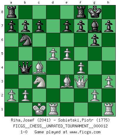 Last move : 1-0 2011 January 17 23:17:3 [Event "FICGS__CHESS__UNRATED_TOURNAMENT__000012"] [Site "FICGS"] [Date "2010.10.24"] [Round "1"] [White "Riha,Josef"] [Black "Sobietski,Piotr"] [Result "1-0"] [WhiteElo "2041"] [BlackElo "1775"] 1.f4 d5 2.e3 g6 3.Nf3 Bg7 4.d4 Nf6 5.c4 O-O 6.cxd5 Nxd5 7.e4 Nb6 8.Nc3 Bg4 9.Be3 Nc6 10.d5 Na5 11.h3 Bxf3 12.Qxf3 Qd6 13.e5 Qb4 14.O-O-O Nac4 15.Bxc4 1-0 This chess game has been lost on time (started : 2010.10.24 13:21:25) Bird's Opening Kingside Castling by player Black (move 5) Queenside Castling by player White (move 14) Player White won this chess game. Follow this game move after move (download)When you don't know what to play, wait for an idea to come into your opponent's mind. You may be sure that idea will be wrong. (Siegbert Tarrasch) Ohne Fehler kann es keine Brillanz geben. (Emanuel Lasker) Uno por uno, yo los acribillé, mi superioridad muy pronto se volvio aparente. (Jose Capablanca) Les réformistes prétendent que les progrès de la théorie conduiront à la disparition des échecs, et qu'il faut, pour leur rendre vie, en remanier les règles. En réalité, qu'exprime cette affirmation? Le mépris de l'intuition, de l'imagination et de tous les autres éléments qui font des échecs un art. (Alexander Alekhine) A good book on your shelf is a friend that turns its back on you and remains a friend. (Author unknown)