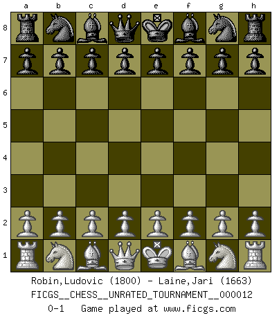 Last move : 0-1 2010 December 3 22:26:47 [Event "FICGS__CHESS__UNRATED_TOURNAMENT__000012"] [Site "FICGS"] [Date "2010.10.24"] [Round "1"] [White "Robin,Ludovic"] [Black "Laine,Jari"] [Result "0-1"] [WhiteElo "1800"] [BlackElo "1663"] 0-1 This chess game has been lost on time (started : 2010.10.24 13:21:25) Player Black won this chess game. Follow this game move after move (download)Examine moves that smite! A good eye for smites is far more important than a knowledge of strategical principles. (Purdy) Privat ist Kortschnoi kein schlechter Mensch, sehr sympathisch. Aber während des Spiels ist er grausam. Er will dich töten. (Miguel Najdorf) EL Ajedrez es como la vida. (Boris Spassky) Les échecs, c'est l'art d'analyser. (Mikhail Botvinnik) As the days dwindle down... to a precious few. (Maxwell Anderson)
