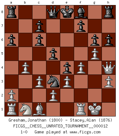 Last move : 1-0 2011 January 10 22:54:18 [Event "FICGS__CHESS__UNRATED_TOURNAMENT__000012"] [Site "FICGS"] [Date "2010.10.24"] [Round "1"] [White "Gresham,Jonathan"] [Black "Stacey,Alan"] [Result "1-0"] [WhiteElo "1800"] [BlackElo "1876"] 1.f4 d5 2.Nf3 Nc6 3.e3 Nf6 4.c3 Bg4 5.h3 Bxf3 6.Qxf3 e5 7.Bb5 e4 8.Qe2 a6 9.Bxc6+ bxc6 10.g4 Nd7 11.O-O Nc5 12.g5 h6 13.Qh5 g6 14.Qh4 Nd3 15.b4 1-0 Bird's Opening Kingside Castling by player White (move 11) Player White won this chess game. Follow this game move after move (download)By this measure (on the gap between Fischer & his contemporaries), I consider him the greatest world champion. (Garry Kasparov) Spielt Blackmar-Diemer-Gambit, und das Matt kommt von selbst! (Emil Joseph Diemer) No solamente yo pronostico su triunfo sobre Botvinnik, sino que me adelanto y digo que probablemente Fischer es el jugador de Ajedrez mas grande que haya existido. (John Collins) À la honte des hommes, on sait que les lois du jeu sont les seules qui soient partout justes, claires, inviolables et exécutées. Pourquoi l'Indien qui a donné les règles du jeu d'échecs est-il obéi de bon gré dans toute la terre, et que les décrétales des papes, par exemple, sont aujourd'hui un objet d'horreur et de mépris ? C'est que l'inventeur des échecs combina tout avec justesse pour la satisfaction des joueurs, et que les papes, dans leurs décrétales, n'eurent en vue que leur seul avantage. L'Indien voulut exercer également l'esprit des hommes et leur donner du plaisir; les papes ont voulu abrutir l'esprit des hommes. Voltaire (Dictionnaire philosophique / Garnier 1967) In theory there is no difference between theory and practice. In practice there is. (Yogi Berra)
