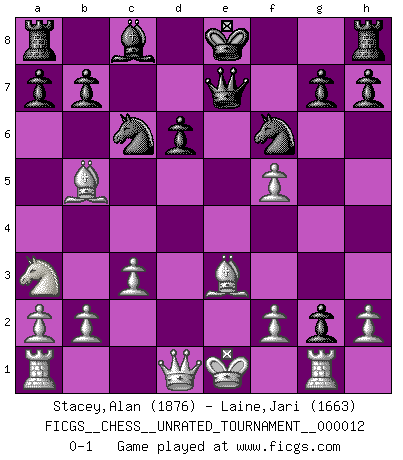 Last move : 0-1 2011 January 23 23:24:36 [Event "FICGS__CHESS__UNRATED_TOURNAMENT__000012"] [Site "FICGS"] [Date "2010.10.24"] [Round "1"] [White "Stacey,Alan"] [Black "Laine,Jari"] [Result "0-1"] [WhiteElo "1876"] [BlackElo "1663"] 1.e4 e5 2.Nf3 Nc6 3.Bb5 Bc5 4.c3 f5 5.exf5 e4 6.d4 exf3 7.dxc5 Qe7+ 8.Be3 fxg2 9.Rg1 Nf6 10.Na3 d6 11.cxd6 cxd6 0-1 Ruy Lopez : Cordel gambit Player Black won this chess game. Follow this game move after move (download)Chess teaches you to control the initial excitement you feel when you see something that looks good and it trains you to think objectively when you're in trouble. (Stanley Kubrick) Ohne ihre Erfolge schmälern zu wollen würde ich sagen Petrosian, Spassky und Karpov verdanken ihre Siege ihren Trainern - Boleslavsky, Bondarevsky und Furman. (Mikhail Moiseyevich Botvinik) Desconfianza es la característica mas necesaria de un jugador de Ajedrez. (Siegbert Tarrasch) L'action d'une oeuvre littéraire se déroule sur un champ de bataille. Les masques et les types du drame moderne correspondent aux pièces du jeu d'échecs. L'intrigue correspond aux coups et aux gambits, c'est à dire aux techniques du jeu telles qu'utilisées et interprétées par les joueurs. Les tactiques et les péripéties [mouvements] correspondent aux coups exécutés par l'adversaire. (Viktor Shklovsky) An expert is a man who has made all the mistakes which can be made in a very narrow field. (Niels Bohr)