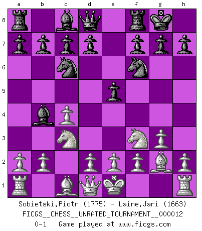 Last move : 0-1 2011 January 8 22:44:47 [Event "FICGS__CHESS__UNRATED_TOURNAMENT__000012"] [Site "FICGS"] [Date "2010.10.24"] [Round "1"] [White "Sobietski,Piotr"] [Black "Laine,Jari"] [Result "0-1"] [WhiteElo "1775"] [BlackElo "1663"] 1.c4 e5 2.Nc3 Nf6 3.Nf3 Nc6 4.g3 Bb4 5.Bg2 O-O 0-1 This chess game has been lost on time (started : 2010.10.24 13:21:25) English Opening Kingside Castling by player Black (move 5) Player Black won this chess game. Follow this game move after move (download)You cannot play at Chess if you are kind-hearted. (French Proverb) Computer sind die einzigen Gegner, die nicht immer eine Ausrede auf Lager haben, wenn sie gegen mich verlieren. (Robert James Fischer) Fischer es el jugador mas fuerte del mundo. De hecho, el jugador mas fuerte que jamas haya existido. (Larry Evans) Même si vous avez un bon coup à faire, regardez toujours s'il n'y en a pas un qui lui soit préférable. (Pedro Damiano) The production of too many useful things results in too many useless people. (Karl Marx)