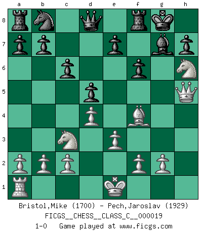 Last move : 1-0 2007 March 3 19:29:55 [Event "FICGS__CHESS__CLASS_C__000019"] [Site "FICGS"] [Date "2006.11.27"] [Round "1"] [White "Bristol,Mike"] [Black "Pech,Jaroslav"] [Result "1-0"] [WhiteElo "1700"] [BlackElo "1929"] 1.d4 Nf6 2.Nf3 g6 3.Nc3 d5 4.Bf4 Bg7 5.e3 O-O 6.Be2 Bg4 7.Ne5 Bxe2 8.Qxe2 c6 9.h4 Qa5 10.h5 Nxh5 11.Rxh5 gxh5 12.Qxh5 f6 13.Ng4 Qd8 14.Nh6+ 1-0 King's Indian : East Indian defense Kingside Castling by player Black (move 5) Player White won this chess game. Follow this game move after move (download)That's what Chess is all about. One day you give your opponent a lesson, the next day he gives you one. (Bobby Fischer) Nur ein wirklich starker Spieler weiß wie schwach er spielt. (Savielly Grigorievitsch Tartakower) Todos los jugadores de Ajedrez deberían tener un pasatiempo. (Savielly Tartakower) Un journaliste : 'Vous préférez avoir une dame de plus sur l'échiquier ou au lit ?' Boris Spassky : 'Ca dépend de la position.' History is the quarrels of popes and kings, with wars or pestilences in every page; the men all so good for nothing, and hardly any women at all. (Jane Austen)