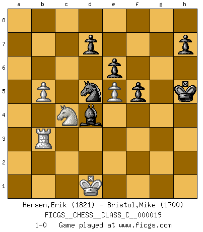 Last move : 1-0 2007 August 19 4:22:59 [Event "FICGS__CHESS__CLASS_C__000019"] [Site "FICGS"] [Date "2006.11.27"] [Round "1"] [White "Hensen,Erik"] [Black "Bristol,Mike"] [Result "1-0"] [WhiteElo "1821"] [BlackElo "1700"] 1.e4 e6 2.d4 a6 3.Nf3 b5 4.Bd3 Bb7 5.Nbd2 c5 6.c3 Nf6 7.e5 Nd5 8.dxc5 Bxc5 9.O-O f5 10.a4 bxa4 11.Qxa4 Nc6 12.Nc4 O-O 13.Bd2 Qc7 14.b4 Nb6 15.Qb3 Nxc4 16.Qxc4 Bb6 17.Rfe1 a5 18.b5 Ne7 19.Qxc7 Bxc7 20.Nd4 Ng6 21.f4 Bb6 22.Ra4 Rfc8 23.Kf2 Rc7 24.g3 Ne7 25.Ke2 g5 26.Nb3 gxf4 27.gxf4 Kf7 28.c4 Rg8 29.Bxa5 Rg2+ 30.Kd1 Nc8 31.Be2 Rxh2 32.Ra3 Rg2 33.Bb4 Rxe2 34.Rxe2 Rxc4 35.Na5 Rxf4 36.Nxb7 Rxb4 37.Rc3 Rd4+ 38.Rd2 Ne7 39.Rcd3 Rxd3 40.Rxd3 Nd5 41.Nd6+ Kg6 42.Rg3+ Kh5 43.Nc4 Bd4 44.Rb3 1-0 This chess game has been lost on time (started : 2006.11.27 5:12:45) St. George defense Kingside Castling by player White (move 9) Kingside Castling by player Black (move 12) Player White won this chess game. Follow this game move after move (download)A big shock; the best chess player in history has passed away. (Lajos Portisch, about Bobby Fischer's death) Ich organisiere ein großes Turnier, was mich etwa 120000 Dollar kostet. Ich denke, das ist das erste Mal in der Schachgeschichte, daß ein Schachgroßmeister auch als Mäzen auftritt. (Miguel Najdorf) El tablero es el mundo, las piezas es el fenomeno del universo, las reglas del juego son lo que llamamos leyes de la naturaleza y el jugador del lado opuesto, se encuentra oculto a nuestra vista. (Thomas Huxley) Les échecs, c'est l'art d'analyser. (Mikhail Botvinnik) It is not enough to be a good player... you must also play well. (Siegbert Tarrasch)