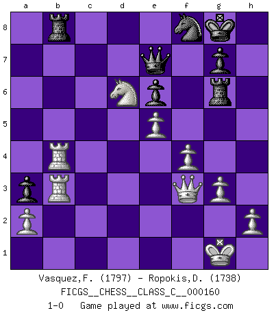 Last move : 1-0 2011 April 17 13:33:21 [Event "FICGS__CHESS__CLASS_C__000160"] [Site "FICGS"] [Date "2010.10.25"] [Round "1"] [White "Vasquez,Fernando"] [Black "Ropokis,Dimitrios"] [Result "1-0"] [WhiteElo "1797"] [BlackElo "1738"] 1.e4 c6 2.d4 d5 3.e5 Bf5 4.Bd3 Bxd3 5.Qxd3 e6 6.Nf3 Ne7 7.O-O Nd7 8.c4 c5 9.cxd5 Nxd5 10.Nc3 Nxc3 11.bxc3 cxd4 12.cxd4 Be7 13.Qe4 Rb8 14.Qg4 Kf8 15.Bg5 h5 16.Qg3 h4 17.Qg4 h3 18.g3 b5 19.Rfc1 Kg8 20.Rab1 a5 21.Bxe7 Qxe7 22.Ng5 b4 23.Nxh3 Rh6 24.Ng5 a4 25.Rc4 a3 26.Rb3 Rg6 27.f4 Qd8 28.Qf3 Qe7 29.Ne4 f6 30.Nd6 fxe5 31.dxe5 Nf8 32.Rcxb4 1-0 Caro-Kann : Advance variation Kingside Castling by player White (move 7) Player White won this chess game. Follow this game move after move (download)A thorough understanding of the typical mating continuations makes the most complicated sacrificial combinations leading up to them not only not difficult, but almost a matter of course. (Siegbert Tarrasch) Der Partner hat auch seine Existenzberechtigung. (Savielly Grigorievitsch Tartakower) Los finales de Peón son del Ajedrez lo que el cesped es del Golf. (Cecil Purdy) Les Echecs ont trois composantes : le temps, l'espace et le matériel en dernier. (Mikhail Tal) There are two kinds of people in the world, my friend. Those who have a loaded gun and those who dig. You dig ! (Blondie in The Good, The Bad and The Ugly)