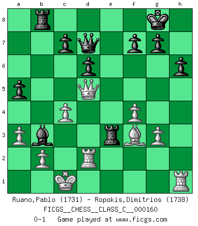 Last move : 0-1 2011 March 13 12:5:11 [Event "FICGS__CHESS__CLASS_C__000160"] [Site "FICGS"] [Date "2010.10.25"] [Round "1"] [White "Ruano,Pablo"] [Black "Ropokis,Dimitrios"] [Result "0-1"] [WhiteElo "1731"] [BlackElo "1738"] 1.d4 Nf6 2.c4 e5 3.dxe5 Ne4 4.Nd2 Bb4 5.Ngf3 Nc6 6.a3 Bxd2+ 7.Bxd2 Nxd2 8.Qxd2 O-O 9.O-O-O Re8 10.e3 Nxe5 11.Be2 d6 12.Nxe5 Rxe5 13.f4 Re8 14.Rhe1 a5 15.Bf3 Bd7 16.Qd4 Qh4 17.Bxb7 Rab8 18.Be4 h6 19.Bf3 Ba4 20.g3 Qxh2 21.Re2 Qh3 22.Rh1 Qd7 23.Qd5 Bb3 24.Rd2 Rxe3 0-1 This chess game has been lost on time (started : 2010.10.25 15:48:8) Budapest : Fajarowicz variation Kingside Castling by player Black (move 8) Queenside Castling by player White (move 9) Player Black won this chess game. Follow this game move after move (download)All my games are real. (Bobby Fischer) Ein Springer auf f6 gegen die eigene Rochadestellung ist schlimmer als ein rostiger Nagel im Knie. (Efim Bogoljubov) Fischer sacrificó virtualmente todo lo que la mayoría de nosotros los 'debiles' (término que él usa) valoramos, respetamos y apreciamos por el amor de un astuto, a menudo hermoso tablero de juego, por el privilegio ambivalente de ser su mas grande maestro. (Paul Kollar) On entre au jeu d'Echecs comme on entre en Religion. Pour le joueur d'Echecs, la partie d'Echecs c'est l'office, la messe, le défilé du 1er Mai, le dépôt de gerbe au Monument aux Morts. C'est un drame sacré. (Michel Roos) Vladimir Ras-Putin is still alive... He is also a good actor, I saw him in the Lord of the Rings. (Rodolfo d'Ettorre)