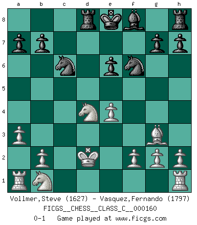 Last move : 0-1 2011 February 19 13:16:56 [Event "FICGS__CHESS__CLASS_C__000160"] [Site "FICGS"] [Date "2010.10.25"] [Round "1"] [White "Vollmer,Steve"] [Black "Vasquez,Fernando"] [Result "0-1"] [WhiteElo "1627"] [BlackElo "1797"] 1.d4 d5 2.c4 dxc4 3.e4 e5 4.Bxc4 Qxd4 5.Qxd4 exd4 6.Nf3 Nc6 7.Bf4 Be6 8.Bxe6 fxe6 9.Bxc7 Rc8 10.Bg3 Nb4 11.Kd2 Nf6 12.Nxd4 Rd8 13.a3 Nc6 0-1 QGA : 3.e4 Player Black won this chess game. Follow this game move after move (download)Live, lose, and learn, by observing your opponent how to win. (Amber Steenbock) Modernes Schach erfordert enorme Anspannung. Es ist für einen normalen Menschen unmöglich das auszuhalten. (Viktor Kortschnoi) La táctica fluye a partir de una posición superior. (Bobby Fischer) Je crois qu'il existe des manières très spécifiques de jouer efficacement contre une machine. Evidemment, nous n'avons aucune chance en technique pure, parce que l'ordinateur calcule de manière parfaite. Mais lorsque nous faisons appel à notre cerveau, en utilisant l'intuition et la compréhension, alors nous restons beaucoup plus forts. (Anatoli Karpov) Panic is a sudden desertion of us, an a going over to the enemy of our imagination. (Christian Nevell Bovee)