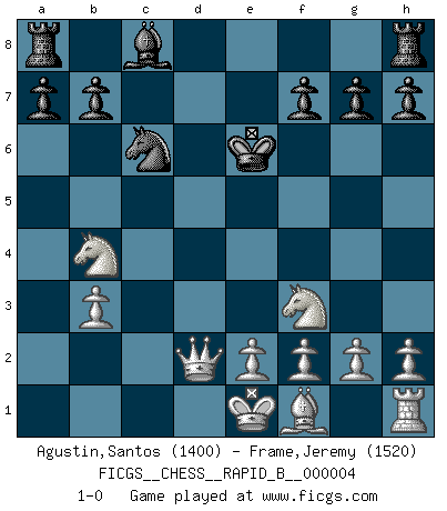 Last move : 1-0 2006 May 13 1:43:55 [Event "FICGS__CHESS__RAPID_B__000004"] [Site "FICGS"] [Date "2006.04.30"] [Round "1"] [White "Agustin,Santos"] [Black "Frame,Jeremy"] [Result "1-0"] [WhiteElo "1400"] [BlackElo "1520"] 1.d4 d5 2.c4 e6 3.Nf3 c5 4.cxd5 exd5 5.Nc3 Nf6 6.Bg5 Be7 7.dxc5 Bxc5 8.Bxf6 Qxf6 9.Nxd5 Qxb2 10.Rb1 Qa3 11.Nc7 Ke7 12.Qd2 Nc6 13.Rb3 Qxb3 14.axb3 Bb4 15.Nd5 Ke6 16.Nxb4 1-0 Queen's gambit declined Player White won this chess game. Follow this game move after move (download)Chess books should be used as we use glasses: to assist the sight, although some players make use of them as if they thought they conferred sight. (Jose Raul Capablanca) Wenn sie aufgeben, dann danke ich Ihnen für das Spiel (Eventualzug beim Fernschach). (Anonymous) Debemos de asegurarnos de que el Ajedrez no se convierta en un lenguaje muerto, muy interesante, pero tan solo para un grupo muy pequeño. (Sytze Faber) 'L'échange des dames est un coup dur pour les deux adversaires...' Un journaliste lors d'une partie du match Spassky-Fischer SEO proverb : Make your website optimized for human beings, not for search engines.