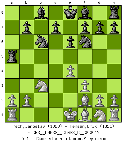Last move : 0-1 2007 March 18 7:12:27 [Event "FICGS__CHESS__CLASS_C__000019"] [Site "FICGS"] [Date "2006.11.27"] [Round "1"] [White "Pech,Jaroslav"] [Black "Hensen,Erik"] [Result "0-1"] [WhiteElo "1929"] [BlackElo "1821"] 1.d4 Nf6 2.Bg5 Ne4 3.Bf4 c5 4.f3 Qa5+ 5.c3 Nf6 6.Nd2 cxd4 7.Nb3 Qb6 8.Qxd4 Nc6 9.Qxb6 axb6 10.Be3 b5 11.Nd4 b4 12.Nb5 Ra4 13.Nc7+ Kd8 14.Bb6 bxc3 15.Nb5+ Ke8 16.Nxc3 Ra6 17.Bf2 e6 18.e4 Ra5 0-1 This chess game has been lost on time (started : 2006.11.27 5:12:45) Trompowsky attack (Ruth, Opovcensky Opening) Player Black won this chess game. Follow this game move after move (download)The defensive power of a pinned piece is only imaginary. (Aaron Nimzovich) Es ist nicht das erste mal, dass sich die FIDE dem Arabischen Geld gebeugt hat (über die FIDE WM 2004 in Lybien). (Larry Evans) Cuando no sepas que mover, espera por una idea que se le venga a la la cabeza de tu oponente. Tenlo por seguro de que esa idea estará incorrecta. (Siegbert Tarrasch) Les Echecs, c'est l'art de la guerre sans les charniers, c'est la résurrection des morts tombés au champ d'honneur, l'espoir perpétuel, la suprématie de l'intelligence sur la force, la culture de l'esprit. (F. Szpiner) Perception is reality. (Immanuel Kant)
