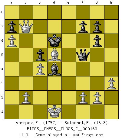 Last move : 1-0 2011 October 10 23:42:8 [Event "FICGS__CHESS__CLASS_C__000160"] [Site "FICGS"] [Date "2010.10.25"] [Round "1"] [White "Vasquez,Fernando"] [Black "Satonnet,Patrick"] [Result "1-0"] [WhiteElo "1797"] [BlackElo "1613"] 1.e4 d5 2.exd5 Qxd5 3.Nc3 Qa5 4.Nf3 Nf6 5.d4 c6 6.Bc4 Bf5 7.O-O e6 8.Bf4 Nbd7 9.Re1 Be7 10.Qd2 Qd8 11.Nh4 Bg6 12.Nxg6 hxg6 13.a3 Nh5 14.Be3 Qc7 15.h3 O-O-O 16.a4 Bd6 17.a5 Ndf6 18.a6 b6 19.Ne2 Kb8 20.Rad1 Ne4 21.Qc1 Nhf6 22.Bd3 Bh2+ 23.Kf1 e5 24.c3 Rde8 25.dxe5 Bxe5 26.Qc2 Nd6 27.c4 Nd7 28.Nc3 Nc5 29.Bxc5 bxc5 30.Ne4 Nxe4 31.Bxe4 Re6 32.Bf3 Rhe8 33.Qa4 Bd4 34.Bxc6 Rxe1+ 35.Rxe1 Rxe1+ 36.Kxe1 Qe5+ 37.Kd1 Qf5 38.Qb5+ Kc7 39.Qb7+ Kd6 40.Bd5 1-0 This chess game has been lost on time (started : 2010.10.25 15:48:8) Scandinavian (centre counter) defense Kingside Castling by player White (move 7) Queenside Castling by player Black (move 15) Player White won this chess game. Follow this game move after move (download)What would Chess be without silly mistakes ? (Kurt Richter) Es hat in meinem Leben Zeiten gegeben, da ich sehr nahe daran war zu glauben, daß ich auch nicht eine einzige Schachpartie verlieren könnte. (José Raúl Capablanca) El jugador de combinación piensa hacia adelante; comienza de la posición dada y trabaja las movidas contundentes en su mente. (Emanuel Lasker) Tout change constamment, y compris dans le monde des Echecs. (Botvinnik) O divine art of subtlety and secrecy! Through you we learn to be invisible, through you inaudible and hence we can hold the enemy's fate in our hands. (Sun Tzu)