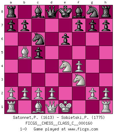 Last move : 1-0 2011 January 3 22:31:14 [Event "FICGS__CHESS__CLASS_C__000160"] [Site "FICGS"] [Date "2010.10.25"] [Round "1"] [White "Satonnet,Patrick"] [Black "Sobietski,Piotr"] [Result "1-0"] [WhiteElo "1613"] [BlackElo "1775"] 1.e4 c5 2.f4 d5 3.Nc3 dxe4 4.Nxe4 e6 5.Nf3 Nc6 6.Bb5 1-0 This chess game has been lost on time (started : 2010.10.25 15:48:8) Sicilian : Grand Prix attack Player White won this chess game. Follow this game move after move (download)Help your pieces so they can help you. (Paul Morphy) Wenn du auf das Glück wartest, wird das Leben ziemlich langweilig. (Mikhail Nekhemyevich Tal) El Peón aislado arroja penumbra sobre todo el tablero. (Aaron Nimzovich) Des points faibles ou des trous dans la position de l'adversaire doivent être occupés par des pièces et non pas par des pions. (Siegbert Tarrasch) As a goal marker shodan is important. As a destination it is a poor place to stop. (Thomas Tamayo)