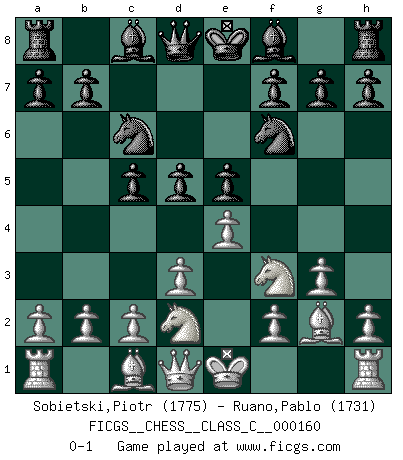 Last move : 0-1 2011 January 6 22:35:3 [Event "FICGS__CHESS__CLASS_C__000160"] [Site "FICGS"] [Date "2010.10.25"] [Round "1"] [White "Sobietski,Piotr"] [Black "Ruano,Pablo"] [Result "0-1"] [WhiteElo "1775"] [BlackElo "1731"] 1.e4 c5 2.d3 e6 3.Nf3 Nc6 4.g3 d5 5.Nbd2 Nf6 6.Bg2 e5 0-1 This chess game has been lost on time (started : 2010.10.25 15:48:8) Sicilian defense Player Black won this chess game. Follow this game move after move (download)That's what Chess is all about. One day you give your opponent a lesson, the next day he gives you one. (Bobby Fischer) Taktik ist was man tun muß, wenn etwas zu tun ist. Strategie ist was man tun muß, wenn nichts zu tun ist. (Savielly Grigorievitsch Tartakower) Peones: ellos son el alma de esta partida, solos forman el ataque y la defensa. (Philidor) Il a essayé de se convaincre qu'il pourrait empêcher toutes les erreurs et ne jamais perdre. L'horreur ! Gary Kasparov au sujet de Robert Fischer. Every vice is only an exaggeration of a necessary and virtuous function. (Ralph Waldo Emerson, Journals 1936)